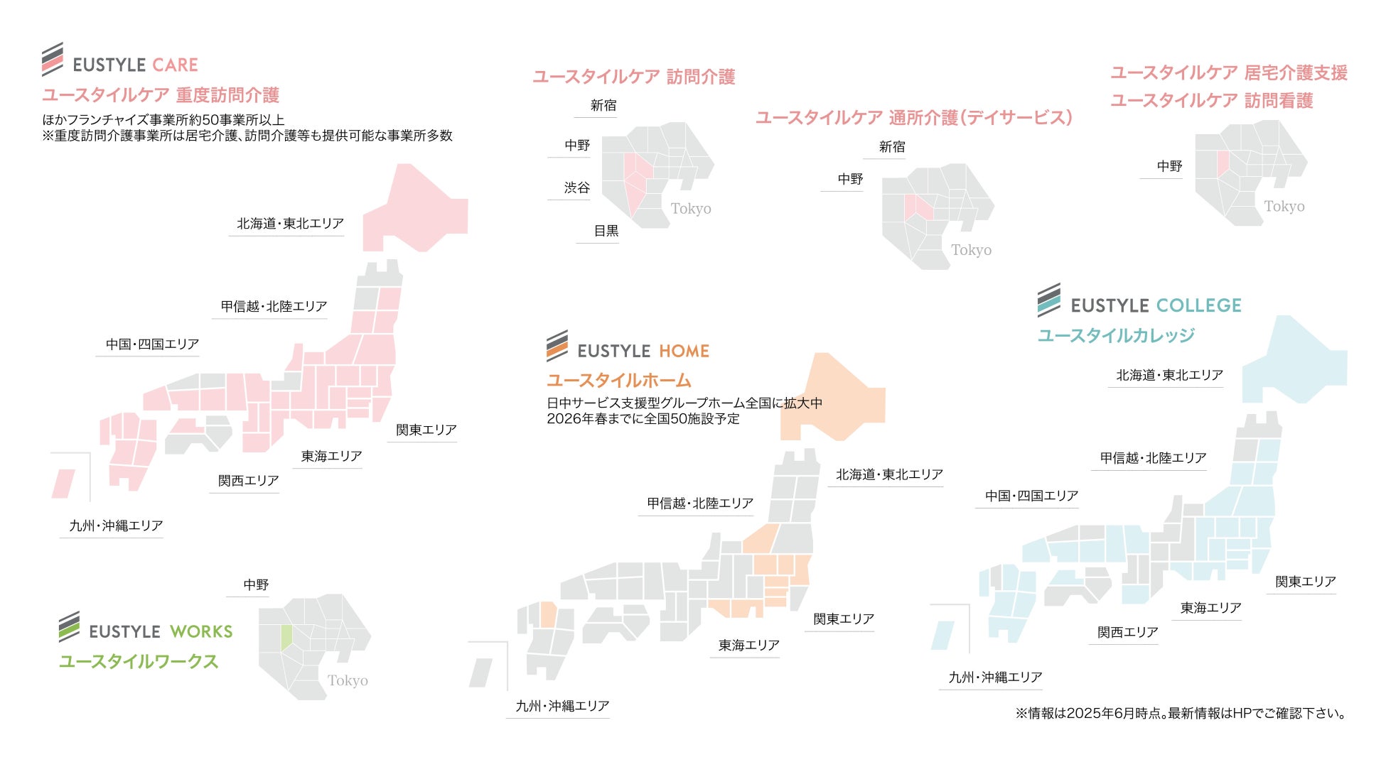 特に、障害福祉分野においては国内最大規模の障害者向け重度訪問介護事業者として、全国にサービスを広げています。 今後も全国各地に新規事業所・新規事業を展開し、日本の介護に関わるあらゆる課題解決に挑戦してまいります。