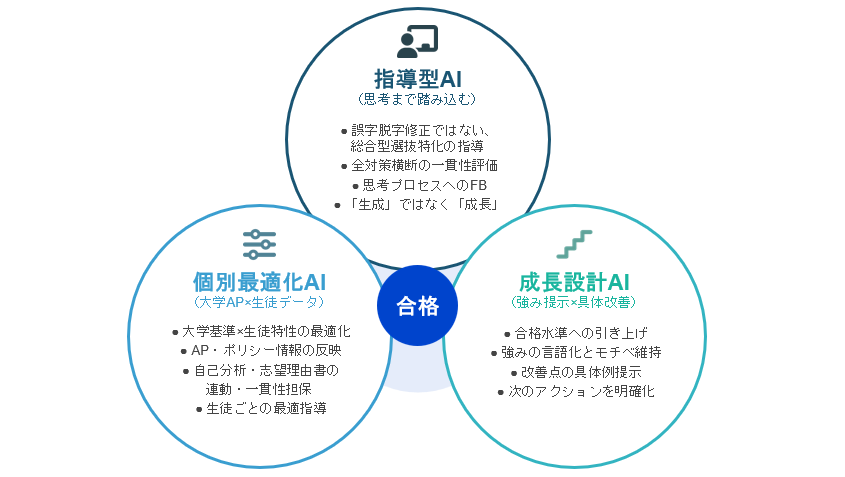 『アオマル』は、単なる文章添削AIではありません。「指導型AI」「個別最適化AI」「成長設計AI」の3つの能力を統合し、自己分析・志望理由書・小論文・面接対策を分断せず、志望校と生徒一人ひとりに最適化された一貫指導を実現する、総合型選抜・AO入試指導特化のソリューションです。