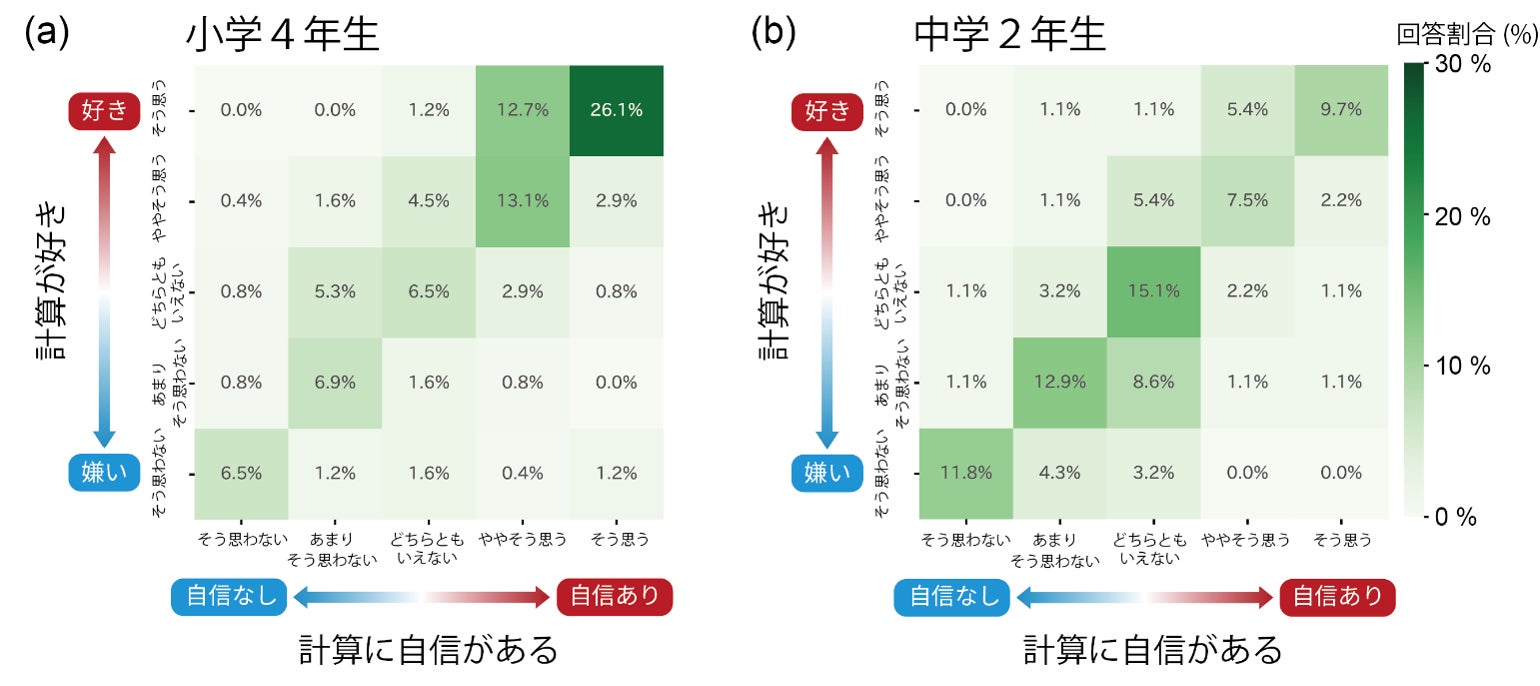 図1(a)は、日本の小学4年生による、「計算が好き (縦軸)」および「計算に自信がある (横軸)」に対する、5段階評価の回答の組み合わせが、それぞれ全体の何パーセント(%)を占めるかを示した分布です。 色が濃いマスほど、その回答を選んだ子どもの割合が高いことを意味します。例えば、右上の最も色が濃いマスは26.1%となっており、これは小学4年生の4人に1人以上が「計算が好き(そう思う)」であり、かつ「計算に自信がある(そう思う)」と回答したことを示しています。このように、回答は肯定的な意識を示す右上の領域に集中しており、小学4年生の時点では計算に対して前向きな意識が大多数を占めていることがわかります。