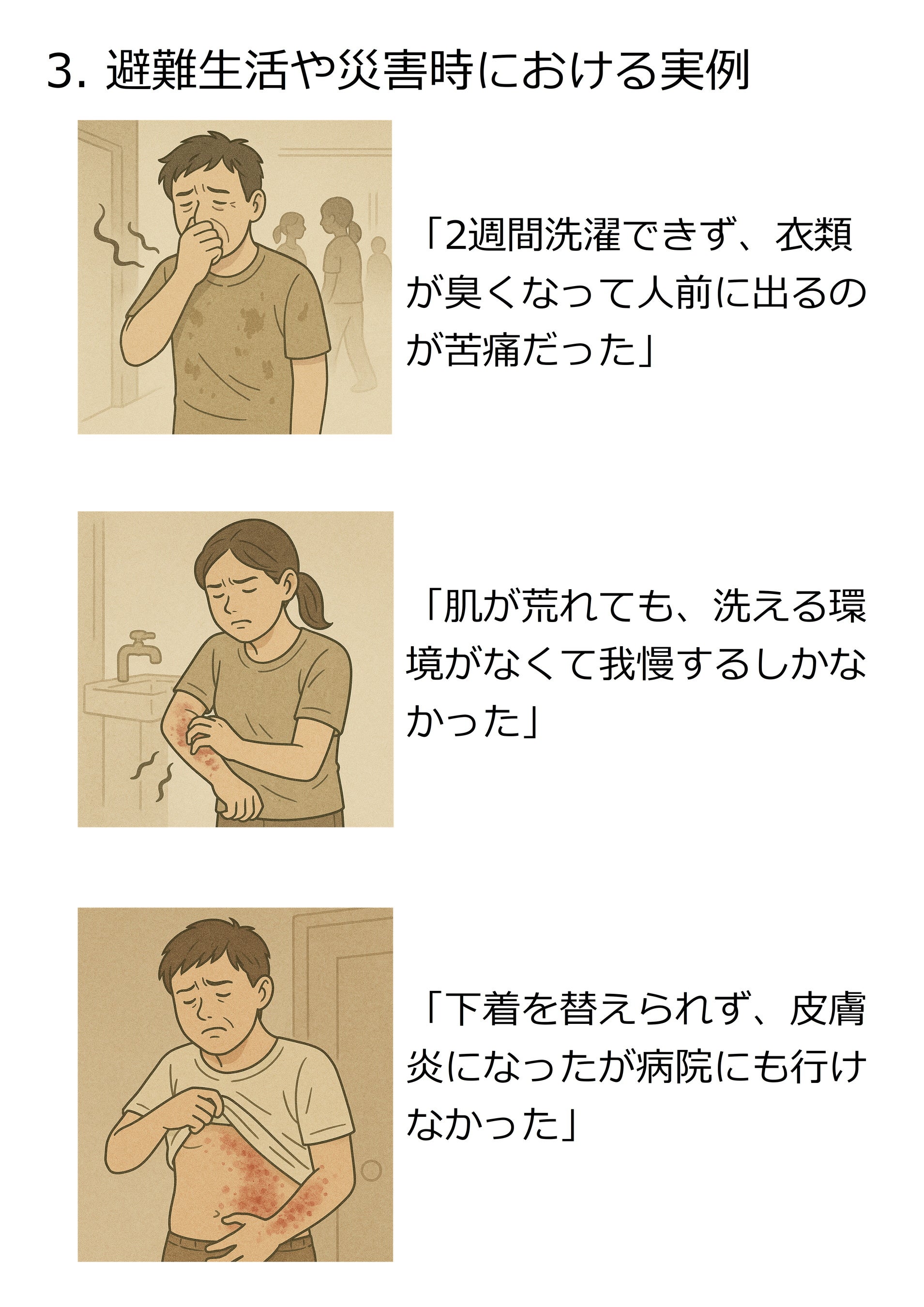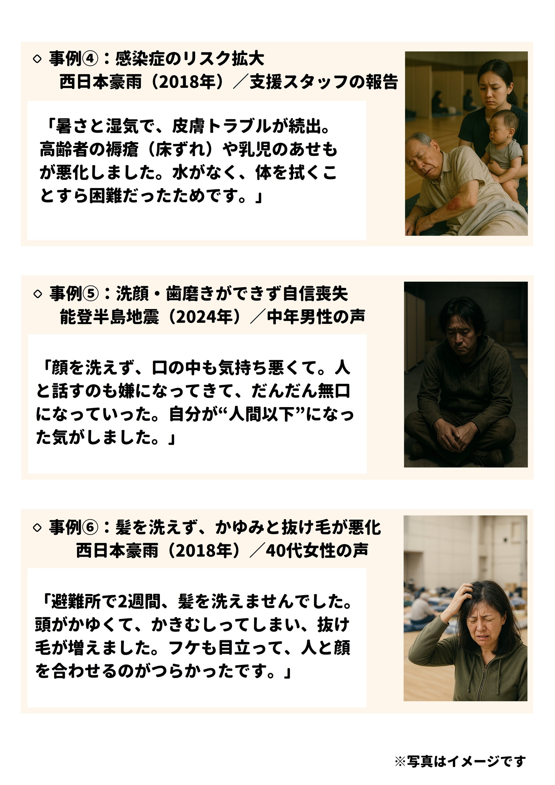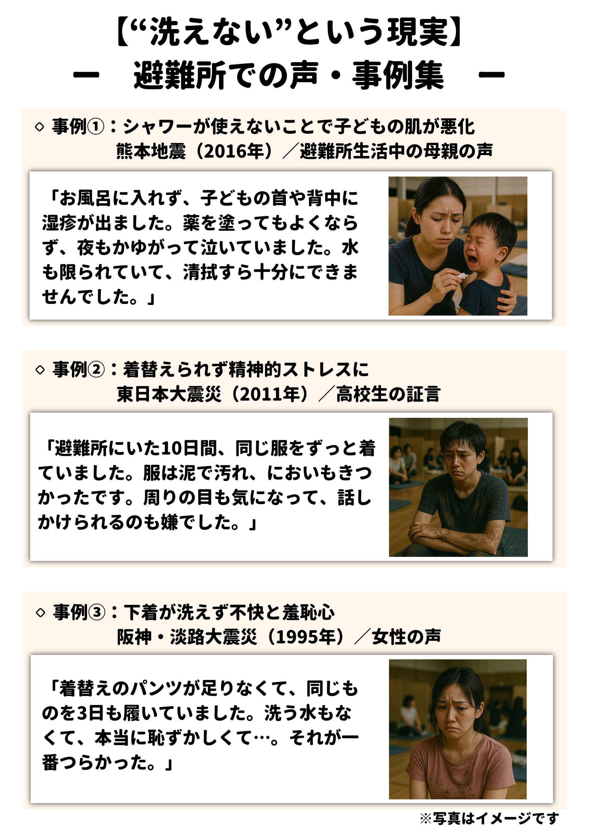 東日本大震災では直接の犠牲者が約1万6千人にのぼり、さらに関連死も3,700人以上確認されています。能登半島地震(2024年)でも、断水による「洗えない苦しみ」が多く報告されました。