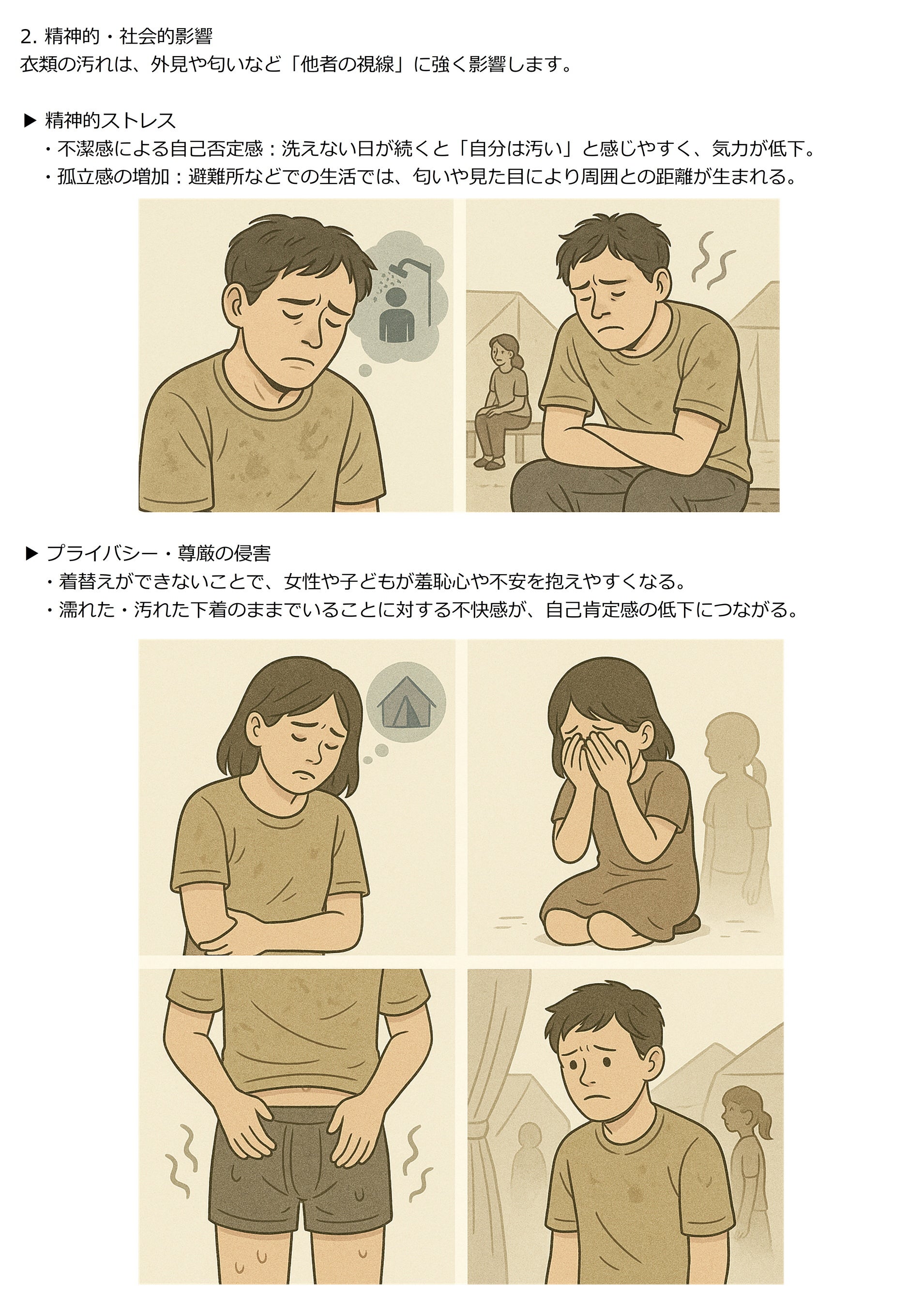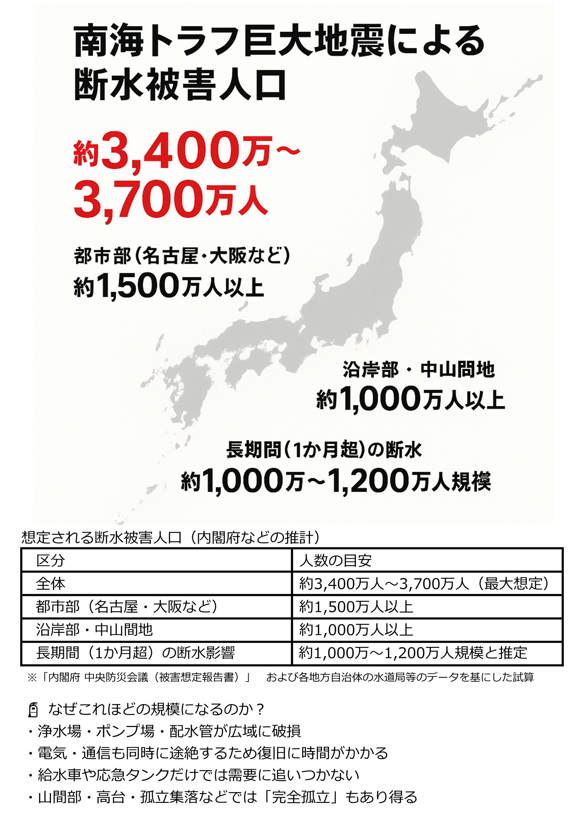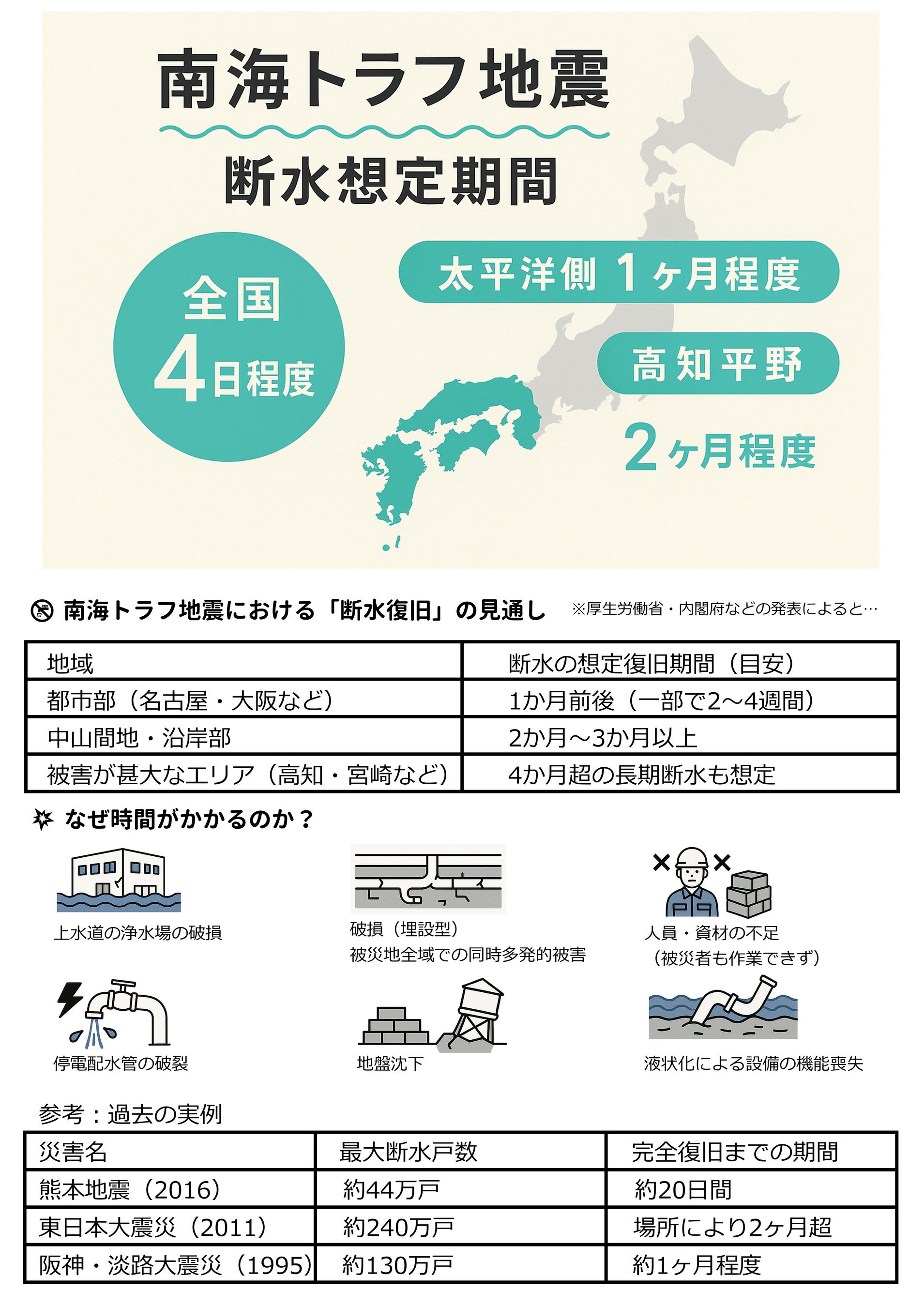 東日本大震災では直接の犠牲者が約1万6千人にのぼり、さらに関連死も3,700人以上確認されています。能登半島地震(2024年)でも、断水による「洗えない苦しみ」が多く報告されました。
