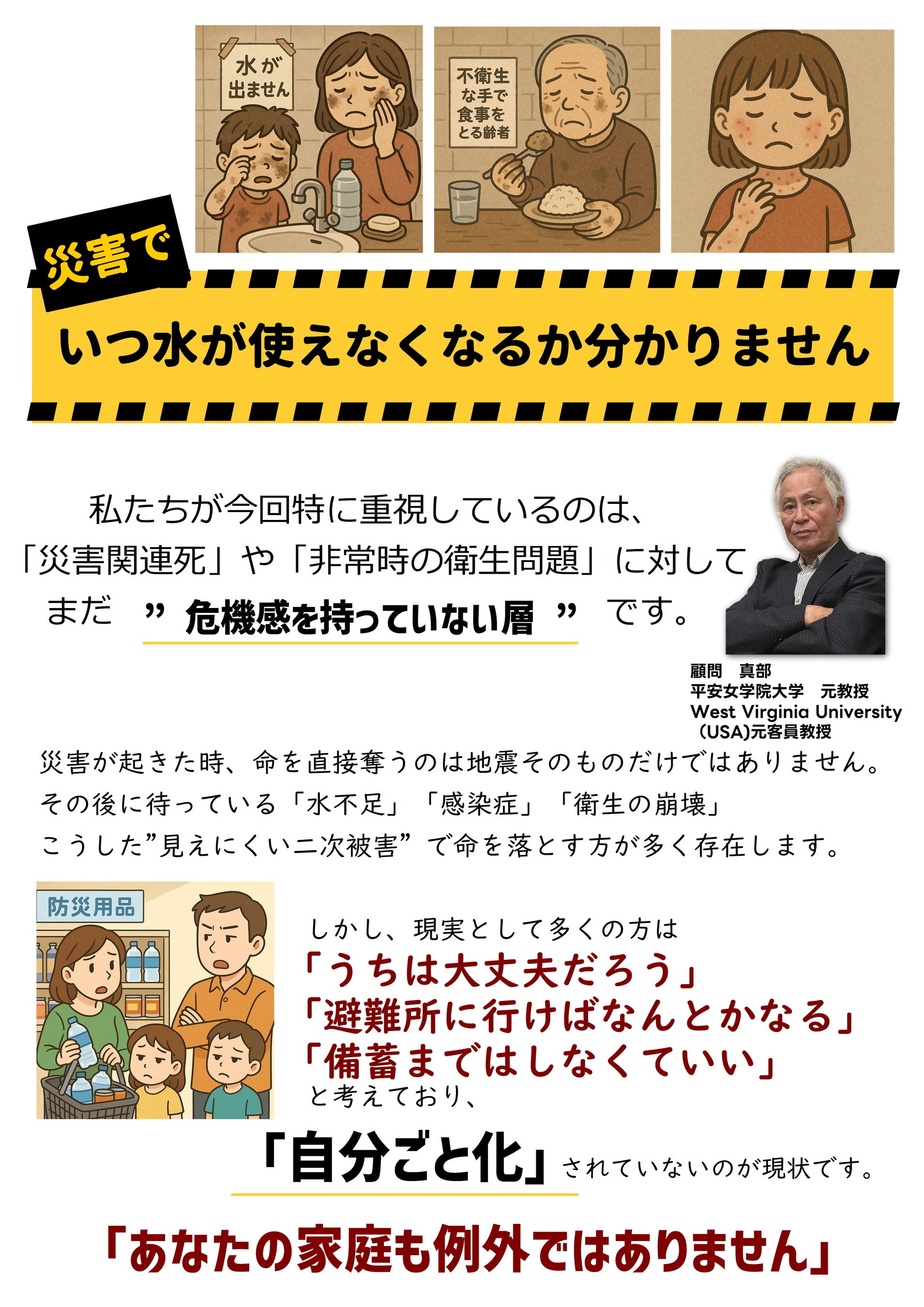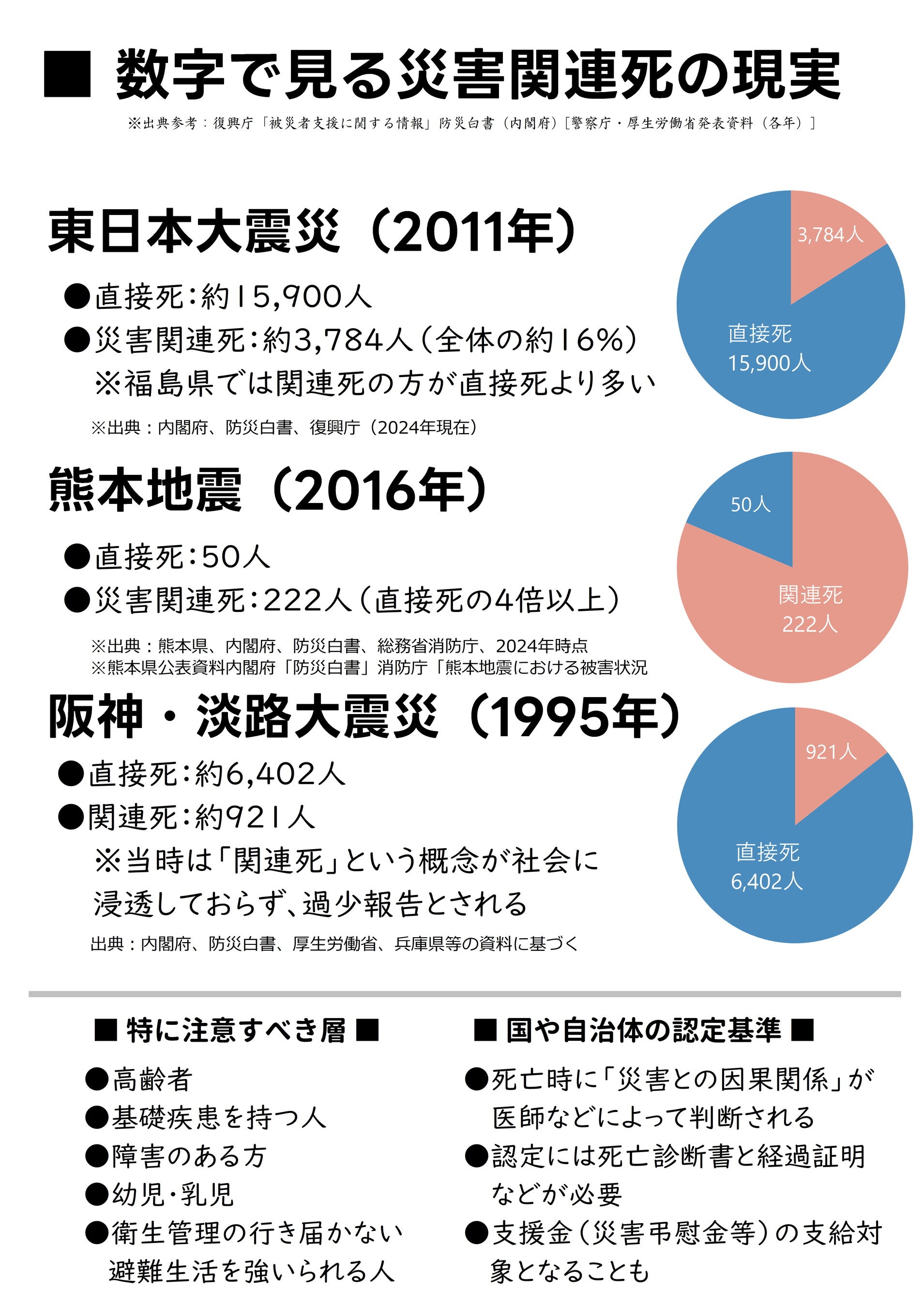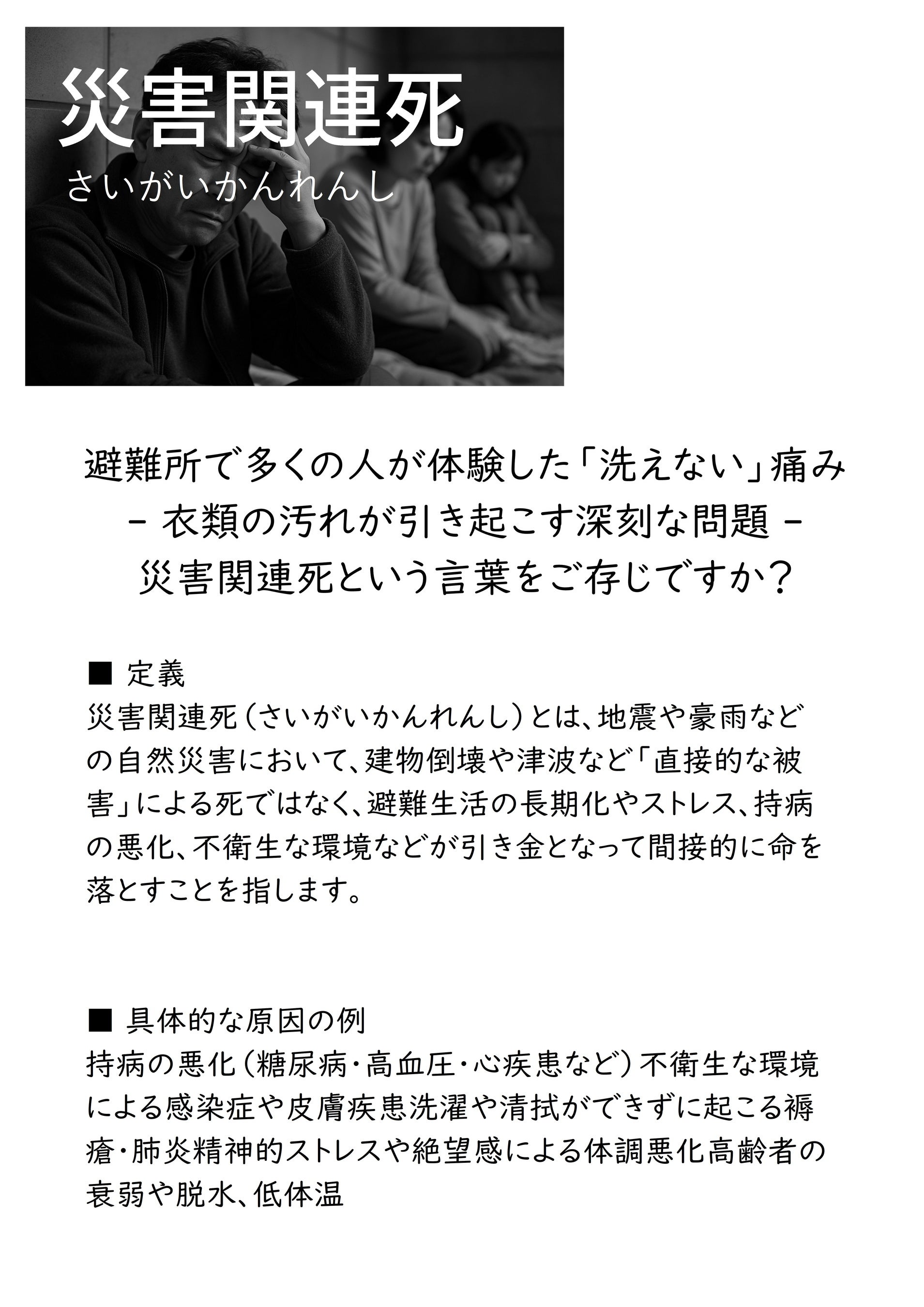 日本では大規模災害のたびに、建物倒壊や津波などによる直接死に加え、避難生活中の不衛生や持病悪化などによる「災害関連死」が問題となっています。