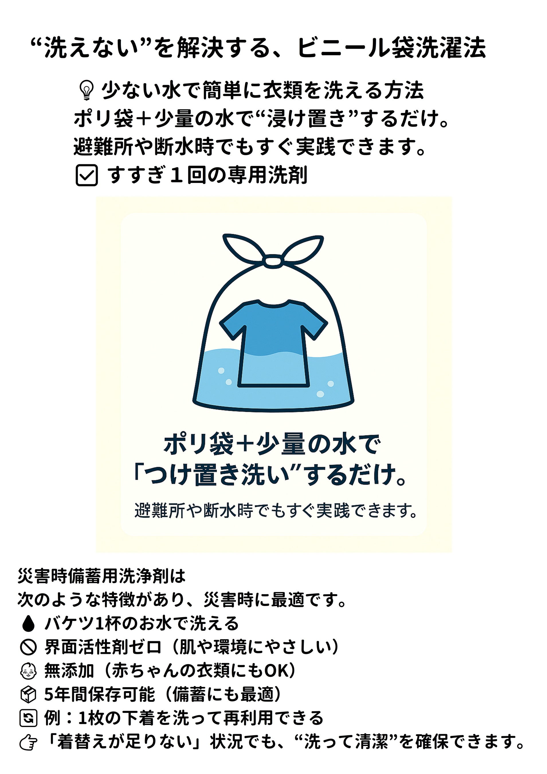 ・専用洗濯袋で軽量&持ち運び可能:避難所でも在宅避難でも使える