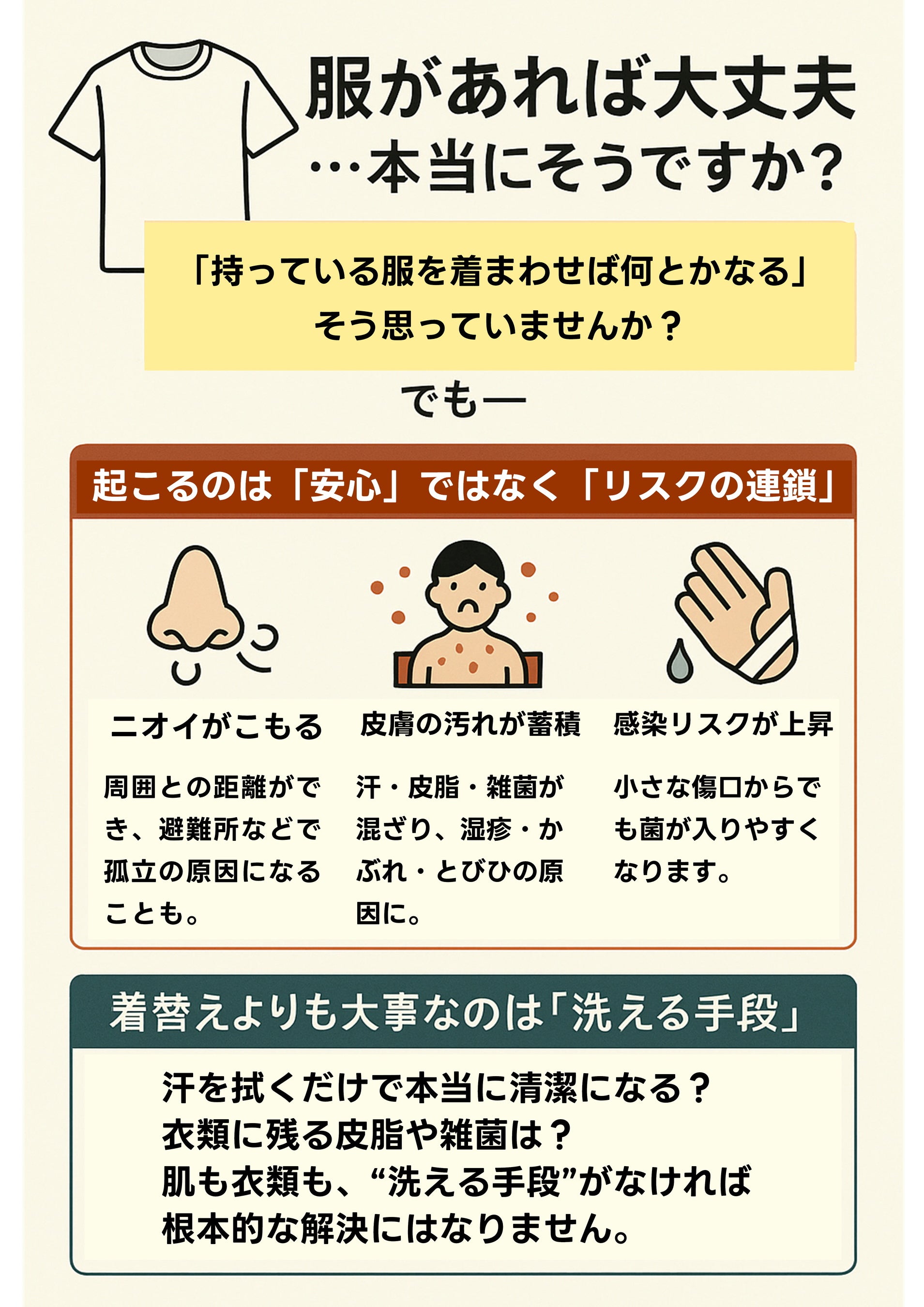 私たちは、わずかな水で清潔を守れる新しい防災セットの開発に取り組みました。