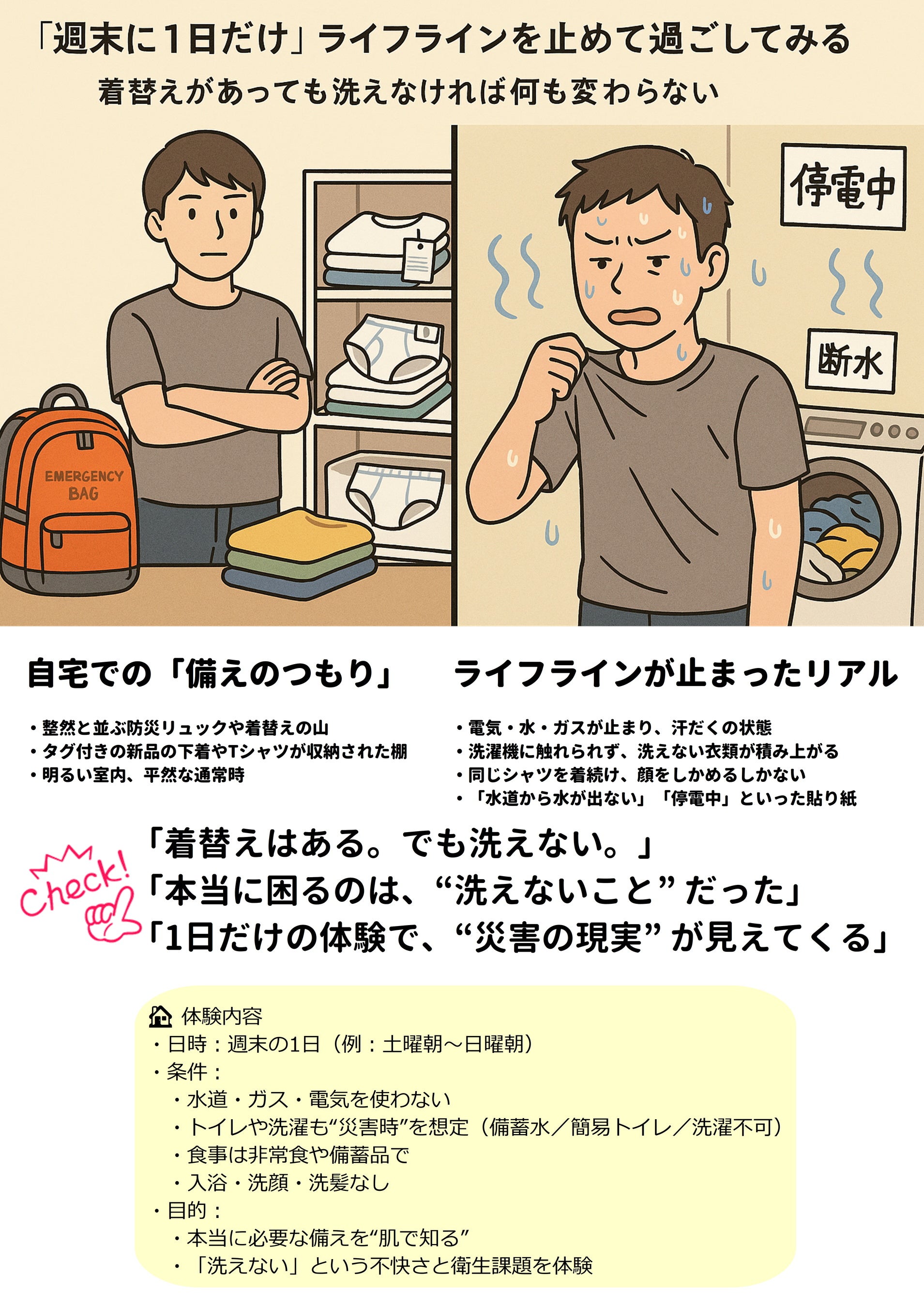 特に見落とされがちなのが「洗濯」の問題です。全自動洗濯機では、4人家族で1回の洗濯に約100Lもの水を必要とし、断水下では使用が事実上不可能となります。汚れた衣類を着続けることは感染症の拡大や心身の疲弊を招き、災害関連死を加速させる要因となります。