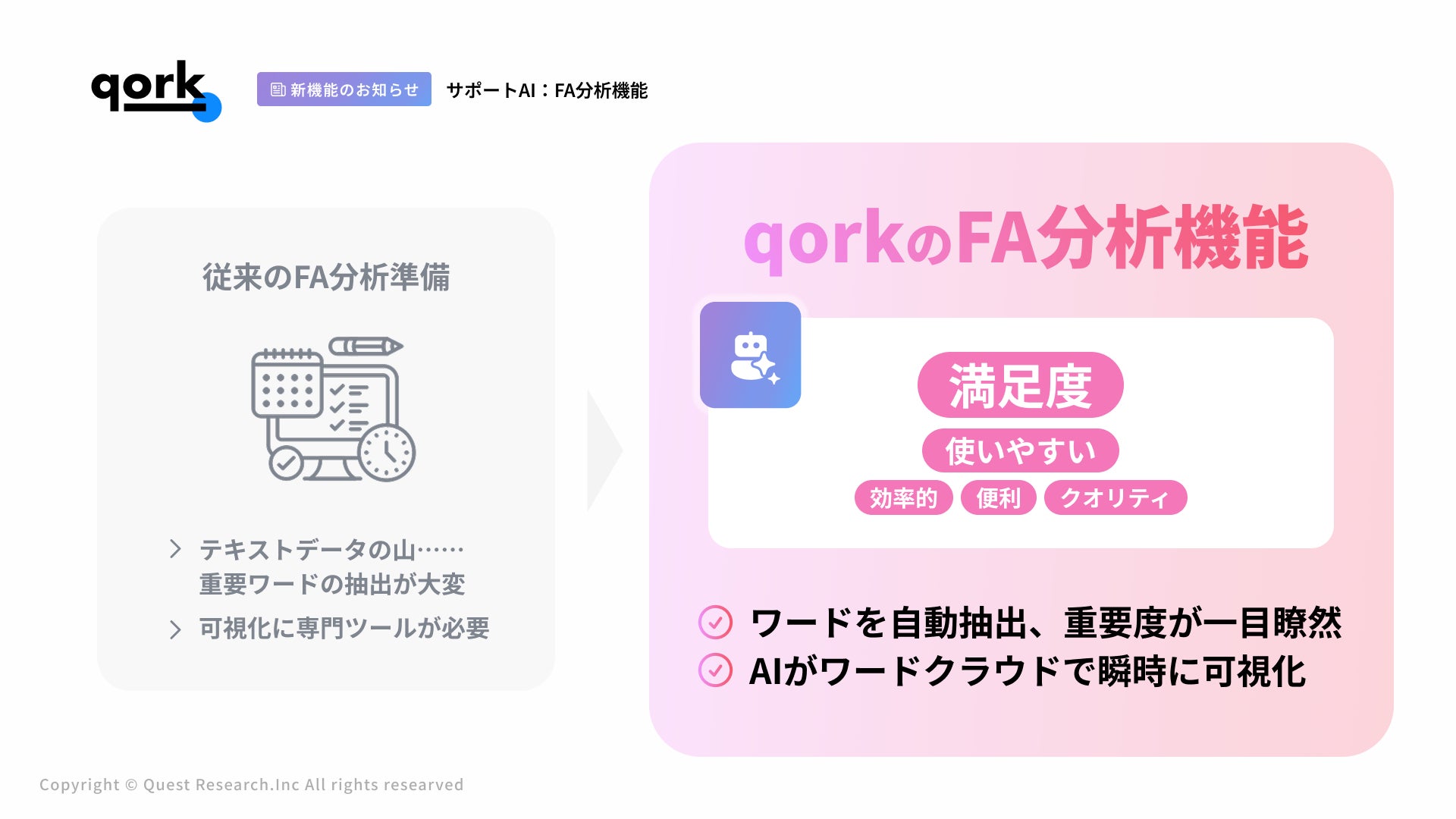 株式会社Quest Research(本社:東京都港区、代表取締役:南健太)は、生成AIを活用したインタビューサービス「qork(コルク)」に、新たにAIチャットベースのFA(自由回答)分析機能を追加したことをお知らせします。