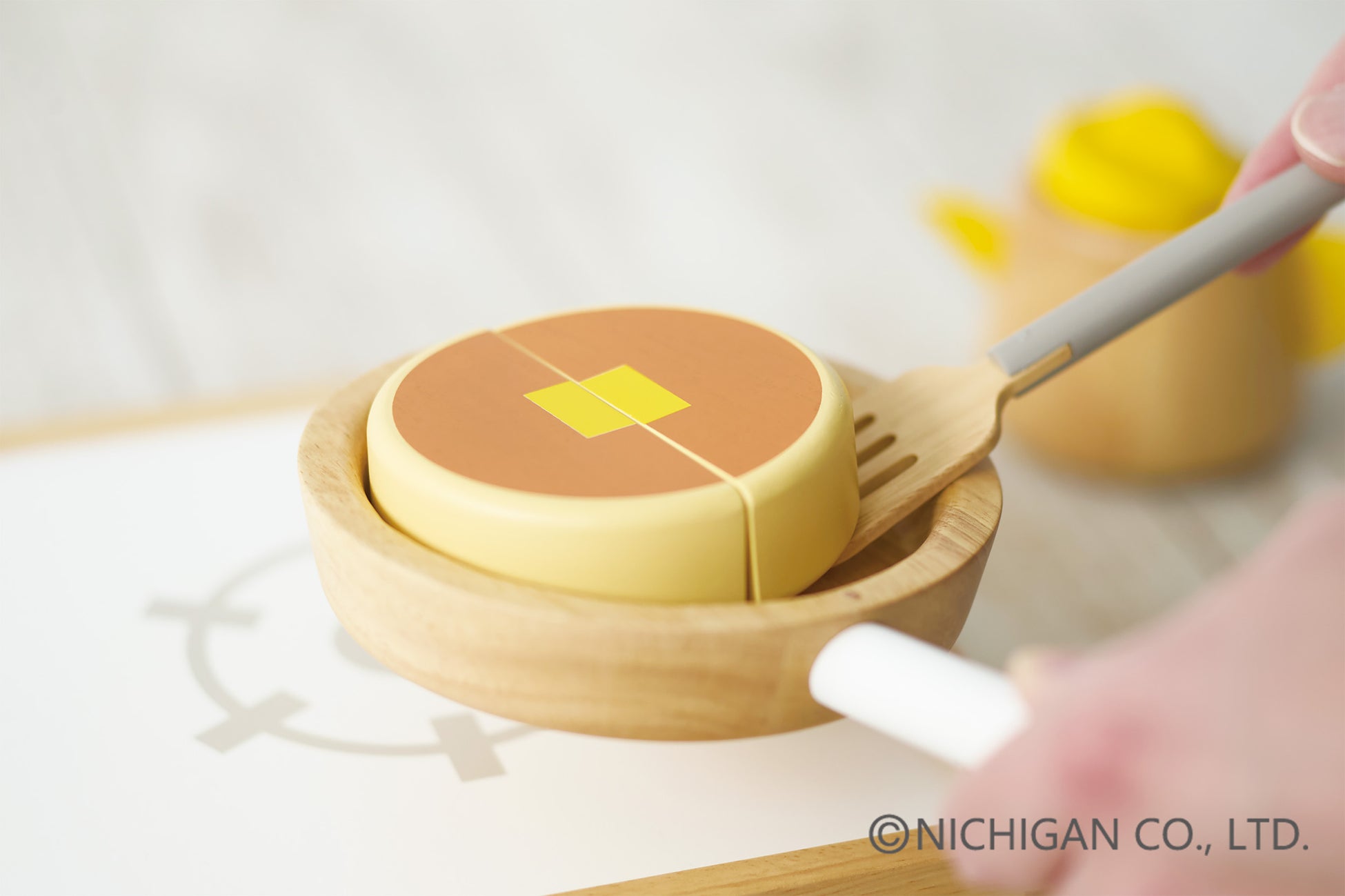 シンプルでありながら本物らしさが感じられるようパンケーキとソーセージには面ファスナーが付いており、ナイフでザクっと切る感触を味わうことが出来ます。