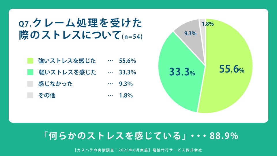 ➤クレーム処理時のストレスについて尋ねたところ、88.9%の回答者が「何らかのストレスを感じている」と回答しました。内訳としては、「強いストレスを感じた」が55.6%、「軽いストレスを感じた」が33.3%で、半数以上が強い負担を感じている状況です。「ストレスを感じなかった」と答えた人はわずか9.3%にとどまりました。
