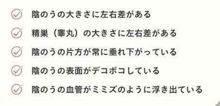 日本精索静脈瘤協会では、3分でできる簡単なセルフチェック法を推奨しています。初期段階では痛みや違和感が軽度なため、見逃されがちですが、早期発見・早期治療が妊娠力を守る鍵となります。治療法としては、中等症から重症の場合には手術が選択されることもありますが、軽症の場合は経過観察となる場合もあります。下記のセルフチェック表のいずれかに該当する場合は、泌尿器科での診察をおすすめします。