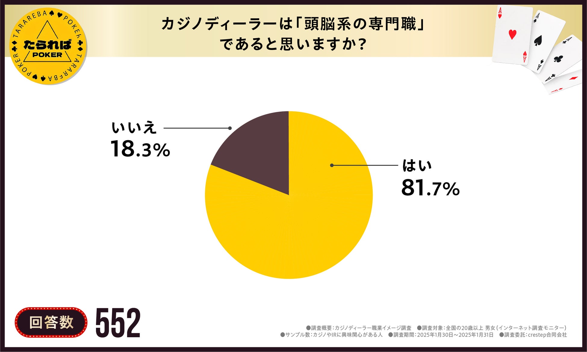 「カジノディーラーが頭脳系の専門職であるか」とアンケート調査を行ったところ、実に80%以上の方が「はい」と回答。カジノには様々な遊び方がありますが、ディーラーという職業は専門職である、という認識が強いようです。