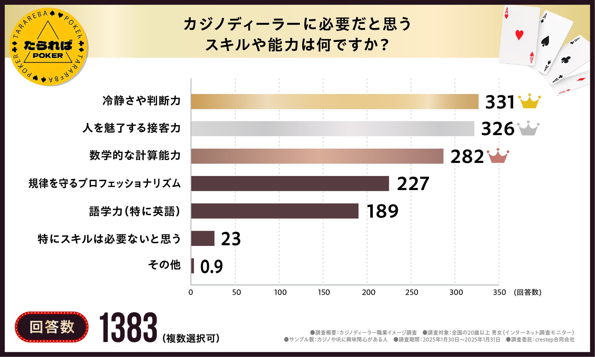 続いて、「カジノディーラーに必要だと思うスキルや能力」について調査をしたところ、