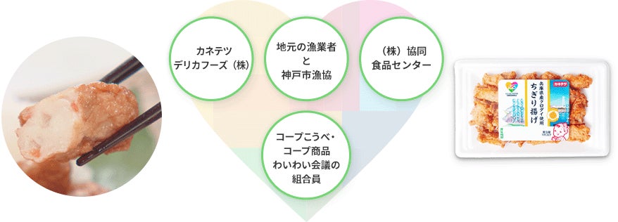 神戸で水揚げされたクロダイを神戸市漁協が冷凍処理し、これを(株)協同食品センター(兵庫県西宮市)がすり身にします。次に、カネテツデリカフーズ(株)が淡路島産玉ねぎ、ごぼう、にんじんなどを加えて練り製品に加工します。地元の企業や団体が商品化に向けて力を合わせます。