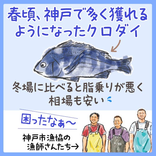 秋冬に獲れるクロダイは、脂が適度に乗り、おいしい魚として知られていますが、春に獲れるクロダイは脂の乗りが悪く、取引価格も安いため、十分に活用されることがありません。