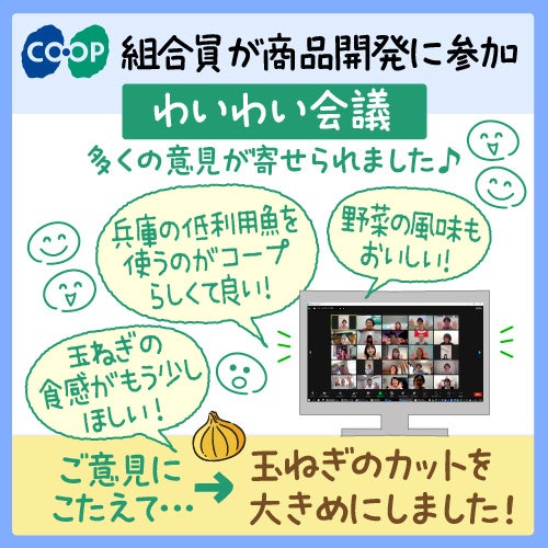 (※コープ商品わいわい会議・・・ 商品の開発や改善について組合員の声を聞く会議です。どんな商品を作るか、味やパッケージについて意見をもらいます。)