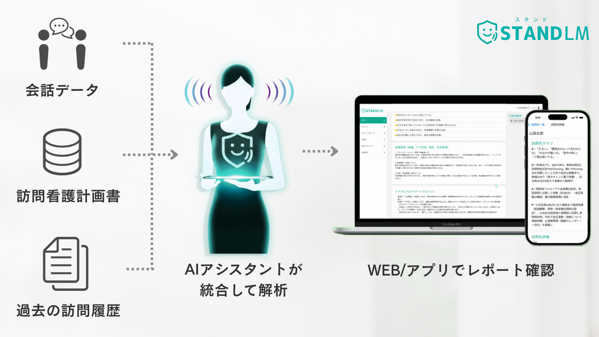 音声AIアシスタント「スタンドLM」 訪問看護向け機能を強化。日々の会話からSOAPを自動作成し記録時間を大幅削減。月次報告書や看護サマリーの出力にも対応。