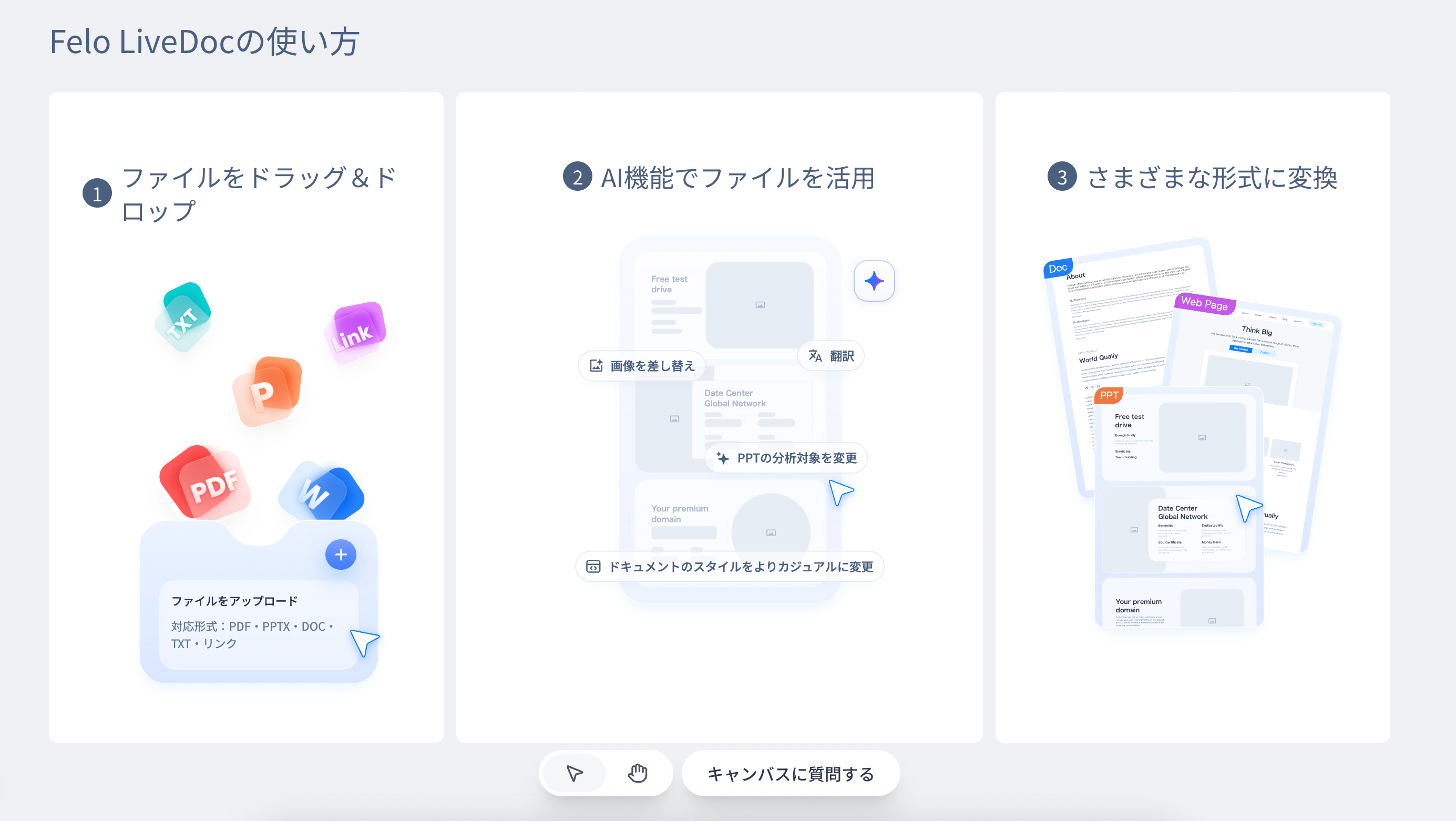 LiveDocキャンバスは、PDF、DOCX、PPTX、Excel、Markdown、テキストファイル、URLなど、複数の異なるファイル形式を無制限に組み合わせて処理できます。既存のファイルをアップロードするだけで、すぐに利用を開始できます。キャンバス上の複数のドキュメントを選択すると、エージェントが以下を実行します:
