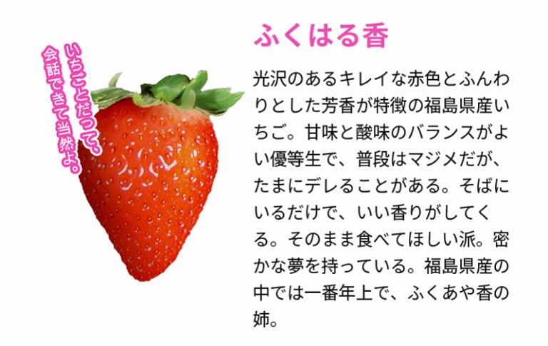 福島県は、3月12日、県民をはじめ多くの皆様に「福島県産オリジナル品種のいちご」を楽しく学び、理解を深めて頂くために、いちごと出会い、対話をしながら選択形式でハッピーエンドを目指すシミュレーションゲーム「いきなりストロベリー」を作成しました。このゲームはブラウザ上で楽しめるゲームとなっており、スマートフォンでもPCでも遊んで頂ける仕様となっております。登場するいちごは、「ゆうやけベリー」「ふくはる香」「ふくあや香」の福島県オリジナル3品種。その特徴が2択のクイズ形式で出題され、すべて正解するとラストのハッピーエンドが見られる仕様となっております。