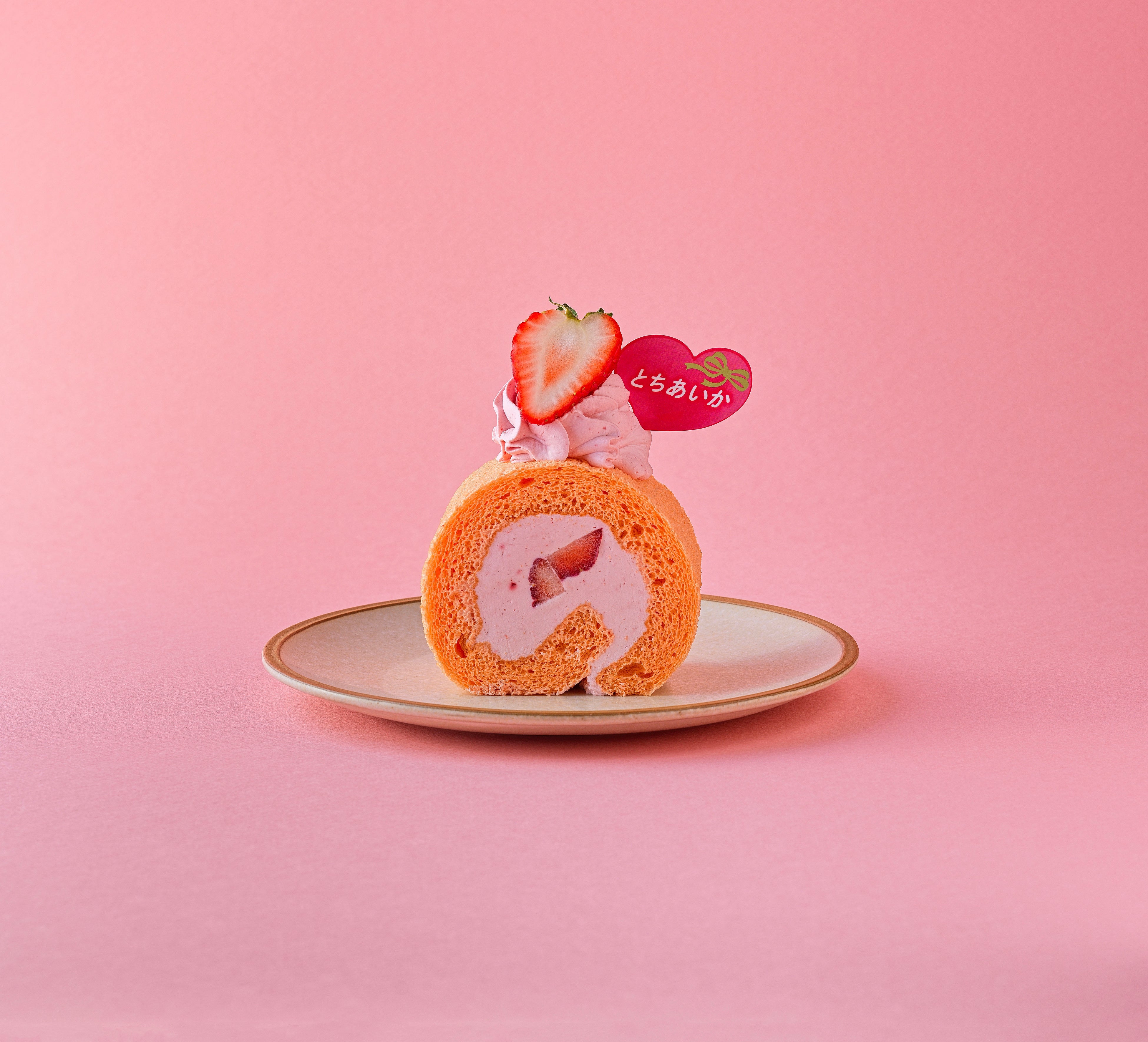 ・商品特長:ピンク色のロール生地にとちあいかを使用したロールケーキ。ロール生地は、ほんのりいちご風味の可愛らしいピンク色に仕上がり、ふわふわもっちりとした生地。中には、いちごの生クリームにごろっととちあいかを入れ巻き上げました。仕上げに、いちご生クリームを絞り可愛らしくとちあいかのハートの断面を飾りました。