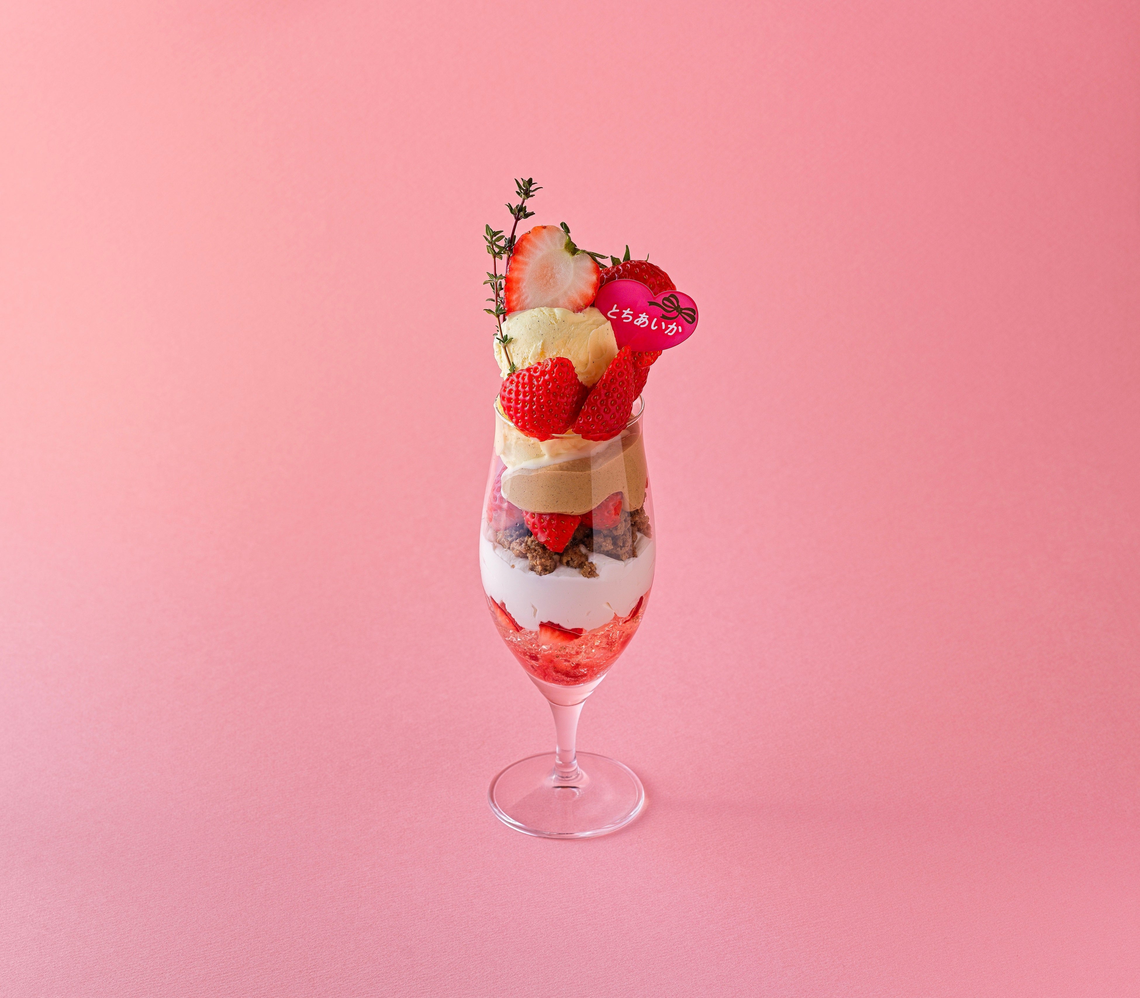 ・商品特長:パフェグラスの底には、甘酸っぱい自家製とちあいかラズベリーソースと爽やかなピーチとミントジュレ、さらにダイス状のとちあいかを忍ばせました。その上には、濃厚でありながら後味さっぱりの生クリーム、ザクザクとした食感が楽しいアールグレイのクランブル、上品な香りが広がるアールグレイカスタードを重ね、贅沢にとちあいかを詰め込みました。トップには、バニラビーンズ入りの濃厚バニラアイスを添え、とちあいか特有の“ハート形の断面”を飾り、華やかに仕上げています。