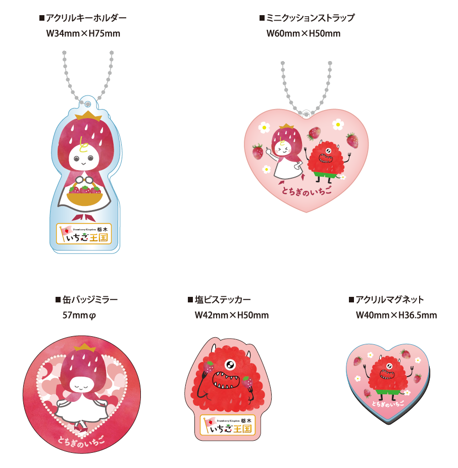 簡単なアンケートにご回答いただくと、ガチャガチャに1回ご参加いただけます。ガチャガチャで当たる商品は5種類。栃木県「いちご王国」のキャラクター「いちごちゃん」の缶バッジミラーやアクリルキーホルダー、「いちごモンスター」のステッカー、アクリルマグネット、「いちごちゃん」と「いちごモンスター」のミニクッションストラップをご用意しております。2つのキャラクターが描かれた巨大パネルも設置しているため、フォトスポットとしてもお楽しみください。