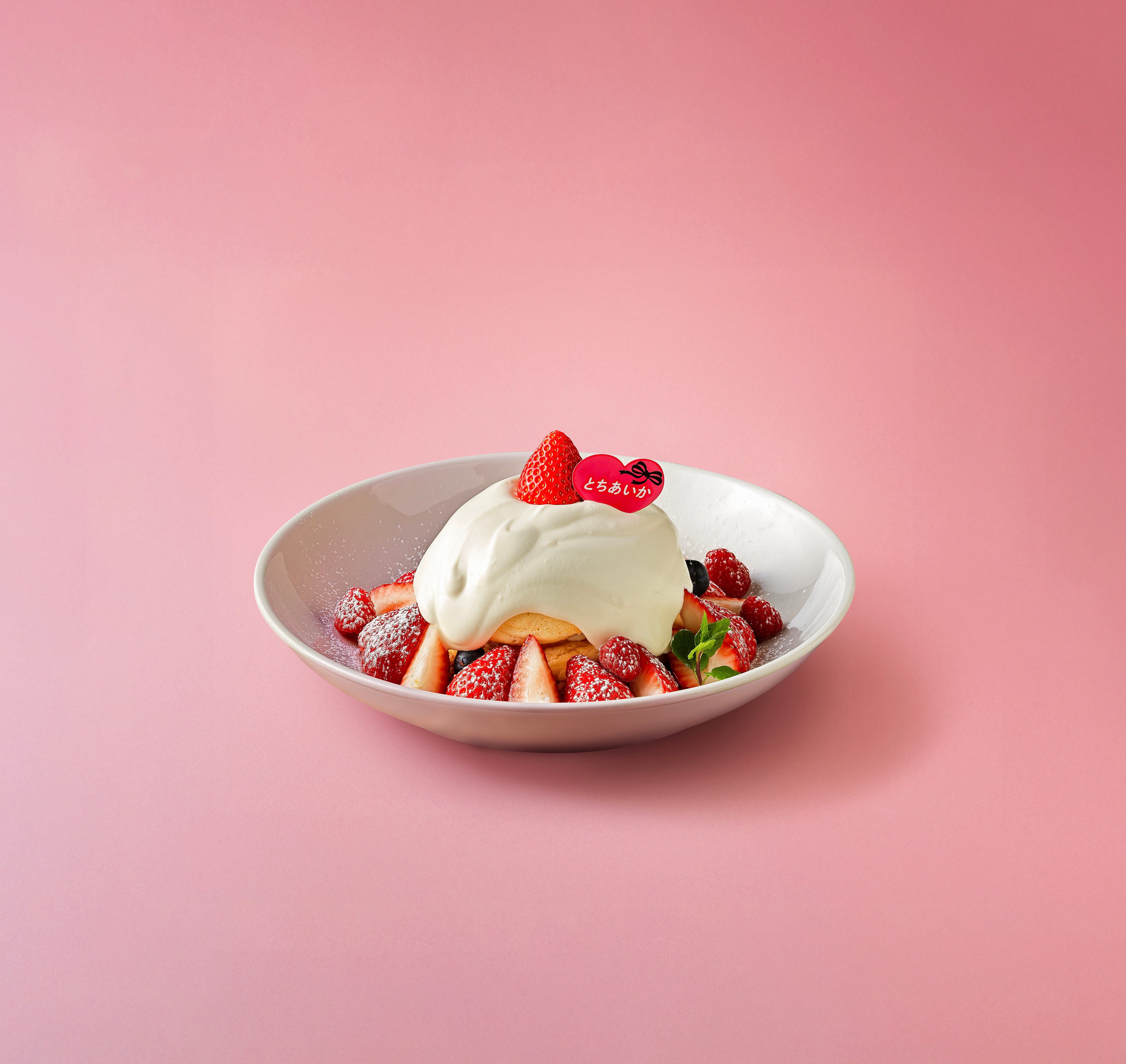 ・商品特長:開業以来、人気メニューとして提供しているパンケーキが初めてアレンジメニューとして登場。旬の栃木県産とちあいかをたっぷり添えたシンプルかつスペシャルな一皿。とちあいかと相性バッチリの練乳を加えた特製クリームで仕上げた、満足の一皿です。