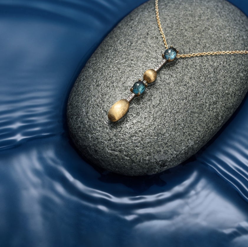 海のような深い青に魅了される、ロンドンブルートパーズ。創設者ラウラも愛するこのストーンはNANIS(ナニス)ジュエリーにはよく使われています。主に18Kゴールド、ダイヤモンド、ロンドンブルートパーズを使用しミニマルでコンテンポラリーなテイストの繊細なペンダントのようなDANCING AZURE (ダンシングアジュール)。