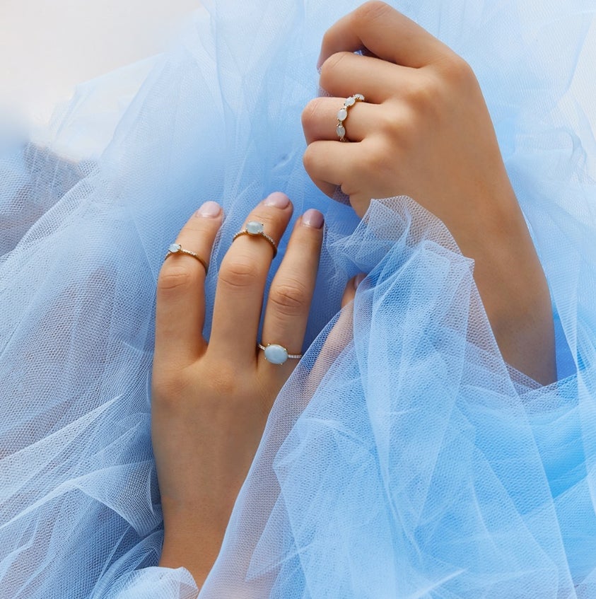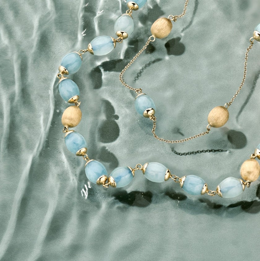 アクアマリンの中に光が溶け込むような特有のやわらかなミルキーブルーは、装いにやさしい彩りを添え、日常にも特別なシーンにも美しく調和します。軽やかでいて存在感のあるデザインは、NANISならではの彫刻的な18Kゴールドと天然石の透明感が織りなす、唯一無二のコンビネーションです。一本で主役になる華やかさを持ちながら、重ね付けにも相性抜群。手元を見るたびに、瑞々しい水光とゴールドの輝きがあなたを包み込みます。