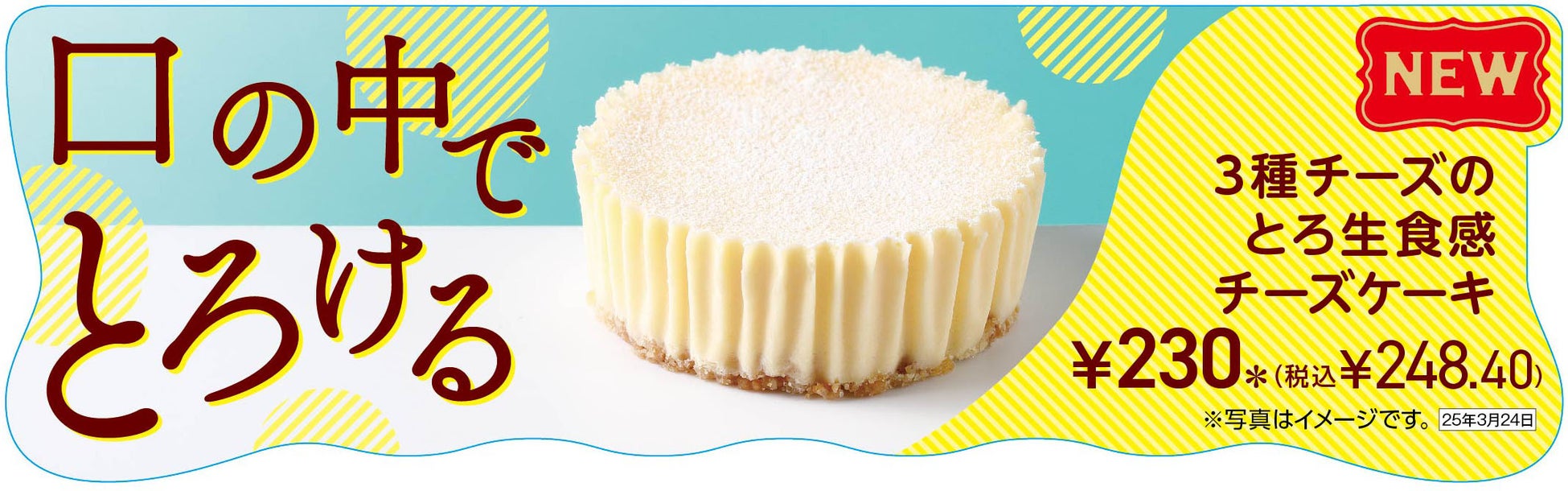 もう一品は、昨年5月の増量キャンペーンでもご好評いただいた「とろ生食感チーズケーキ」をもとに、よりチーズの風味を際立たせた「3種チーズのとろ生食感チーズケーキ」。ミルキーでとろける食感のチーズ層と、塩味のあるクッキー生地との相性がよい、食べ応えのある濃厚なチーズケーキです。チーズ好きな方にはもちろん、すべてのお客様にオススメしたい2つの商品が登場です。