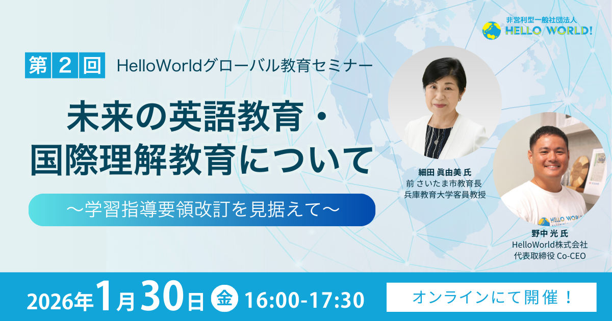 非営利型一般社団法人HelloWorld(所在地:沖縄県沖縄市、代表理事:野中 光・冨田 啓輔)は、2026年1月30日(金)に、「未来の英語教育・国際理解教育について」をテーマにした教育関係者向けセミナーをオンライン(Zoom)で開催いたします。