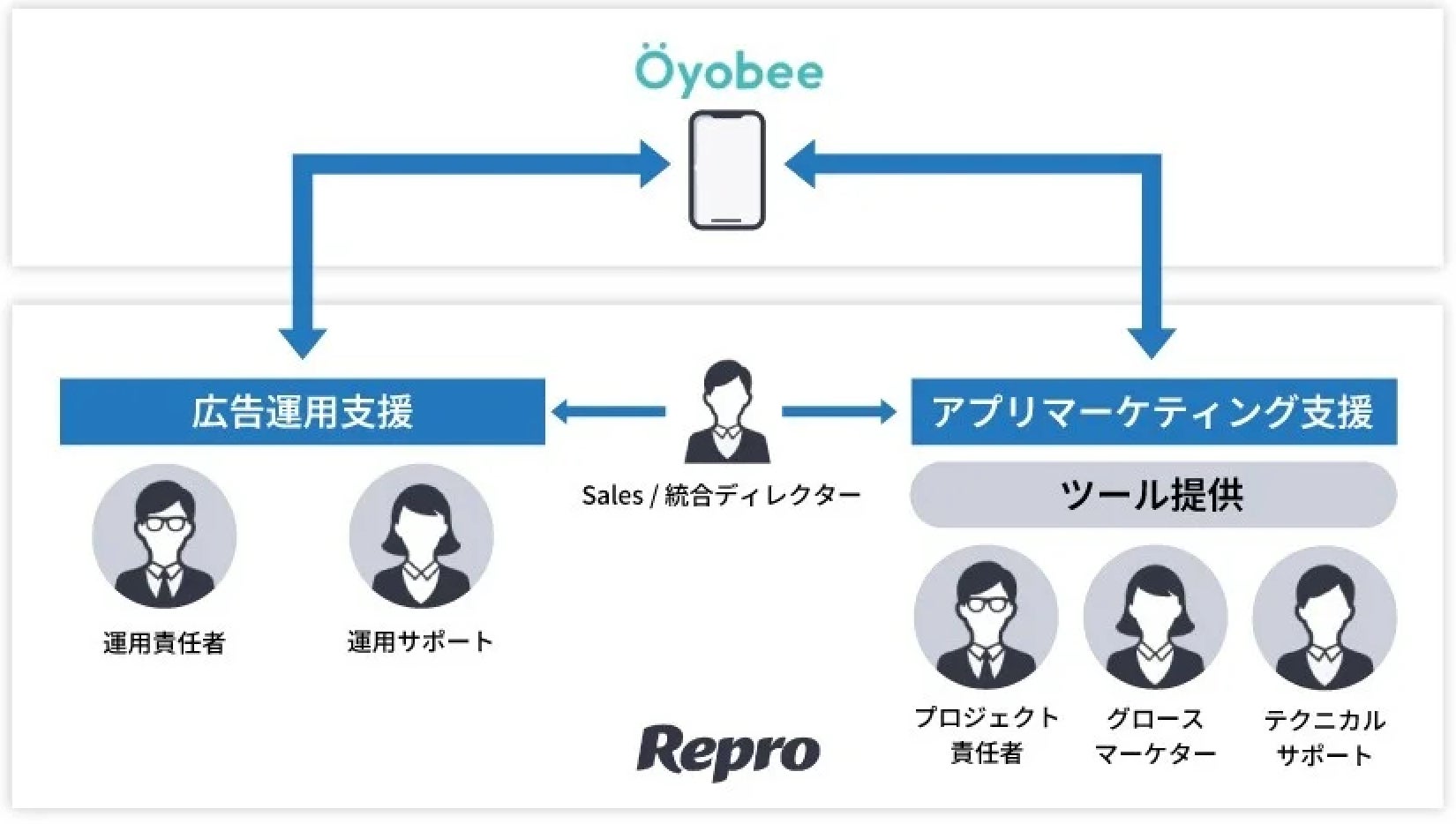 Reproでは、広告運用担当とアプリマーケティング担当をそれぞれ配置し、ユーザー獲得から利用促進、定着・収益化までを一貫してサポートしています。