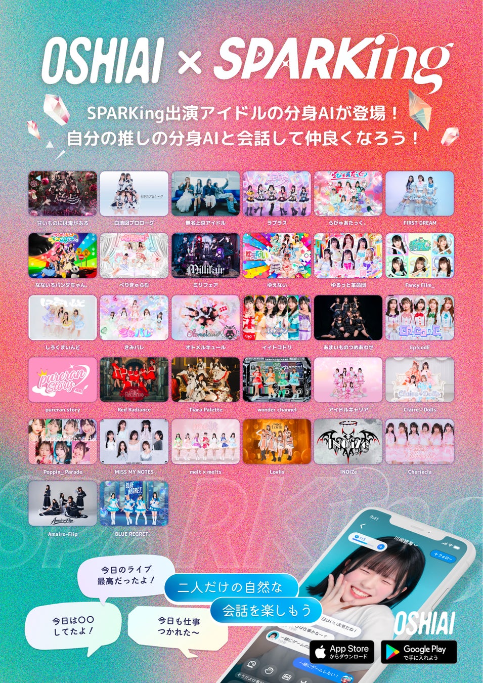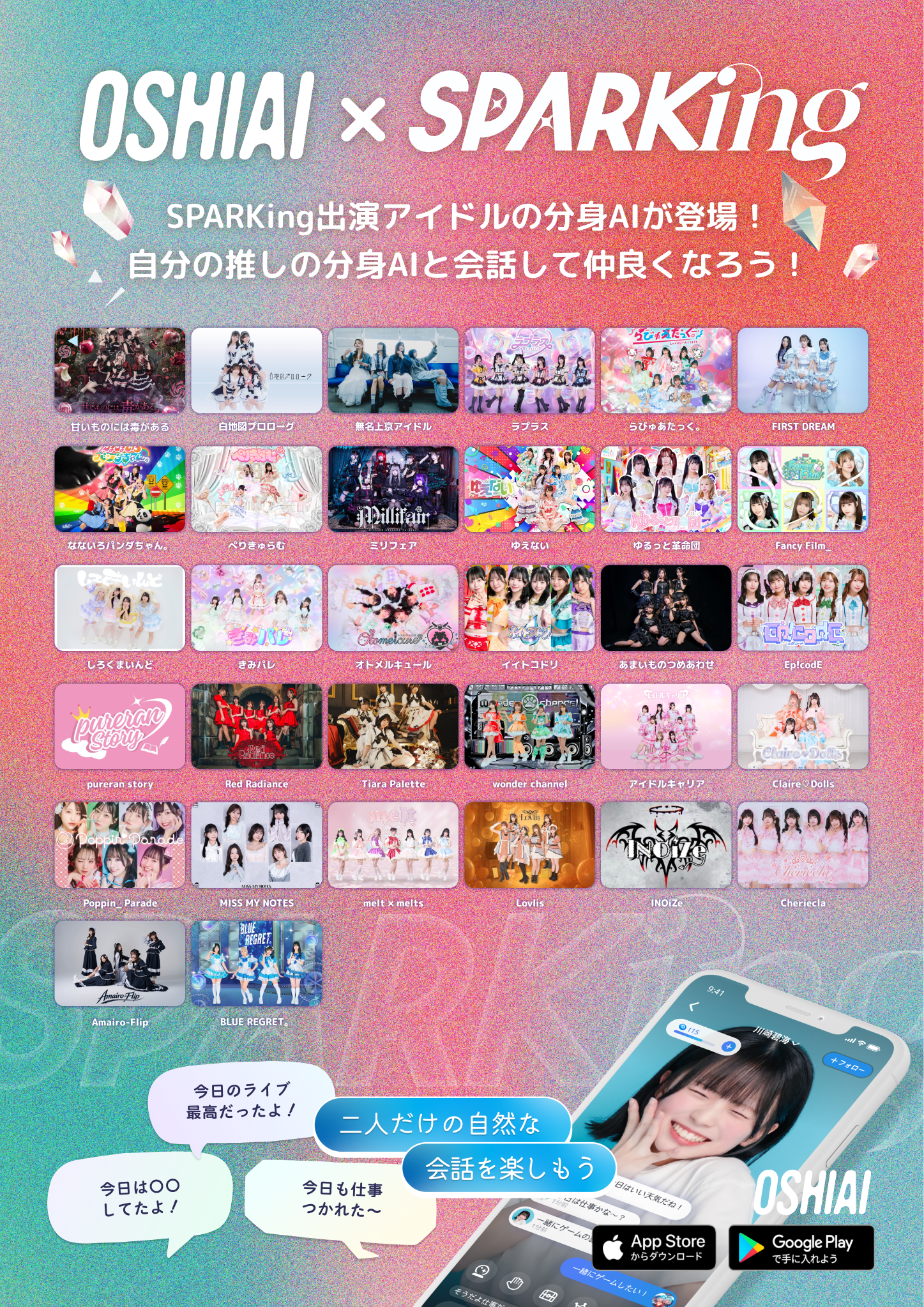 タレントの公認AI(アイ)とチャット・音声によるコミュニケーションを楽しめるAIコミュニケーションアプリ「OSHIAI」にて、ライブアイドルの新たな飛躍の場として注目を集める「SPARKing」に参加する全32組のアイドルグループの“公認AI(アイ)”がリリースされます。一部グループは3/9リリース予定となっております。SPARKingとは3回目のコラボリリースです。