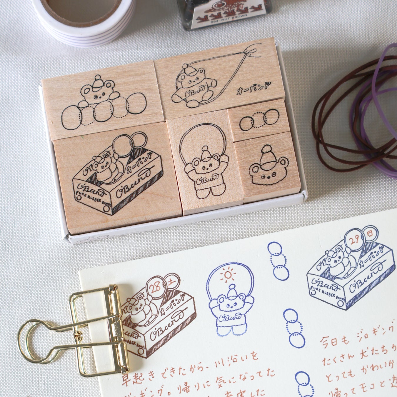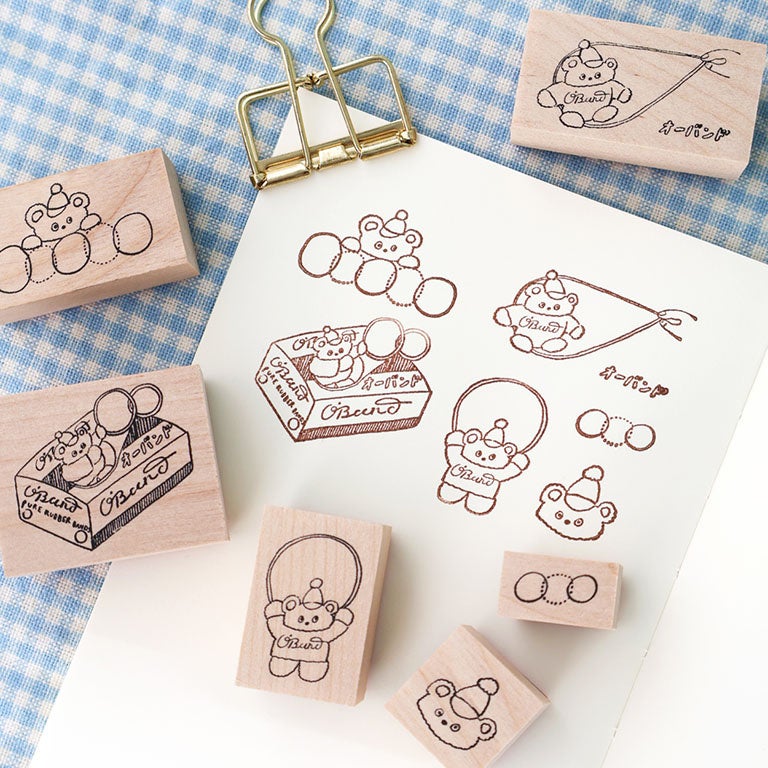 シンプルにそのまま捺すだけでなく、罫線や枠を作ったり、他のスタンプの輪ゴムに連ねて遊んでも楽しく使えます。