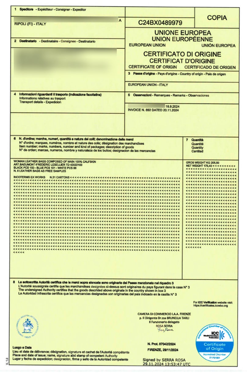 Vetrina Miaがパートナーから受け取るすべての出荷には、正式な「イタリア原産証明書」が添付されており、製品の原産地が保証されています。サプライヤーの名称は秘密保持契約(NDA)により公開できませんが、すべての製品について、正確な製造元までトレース可能な体制を整えています。