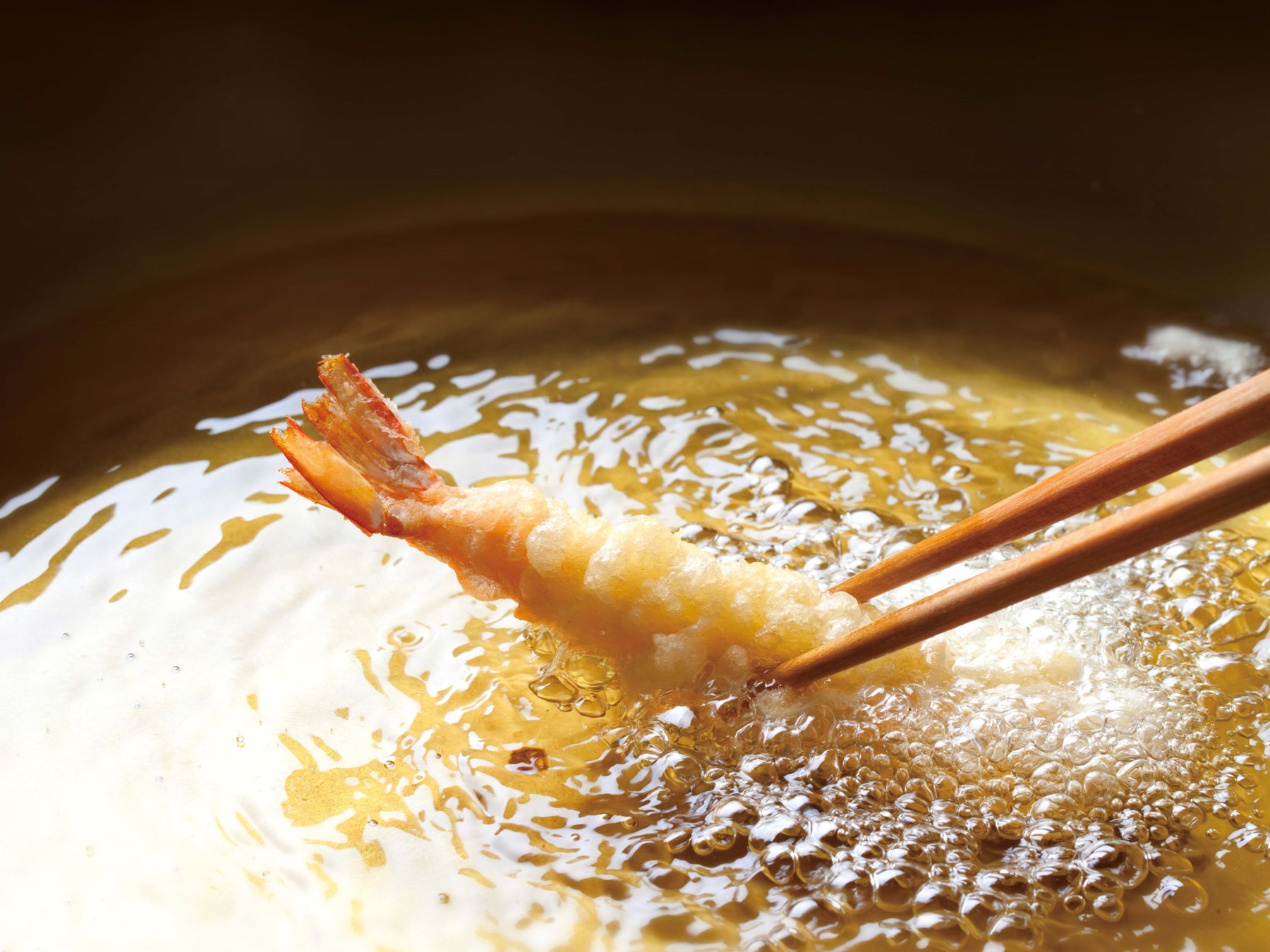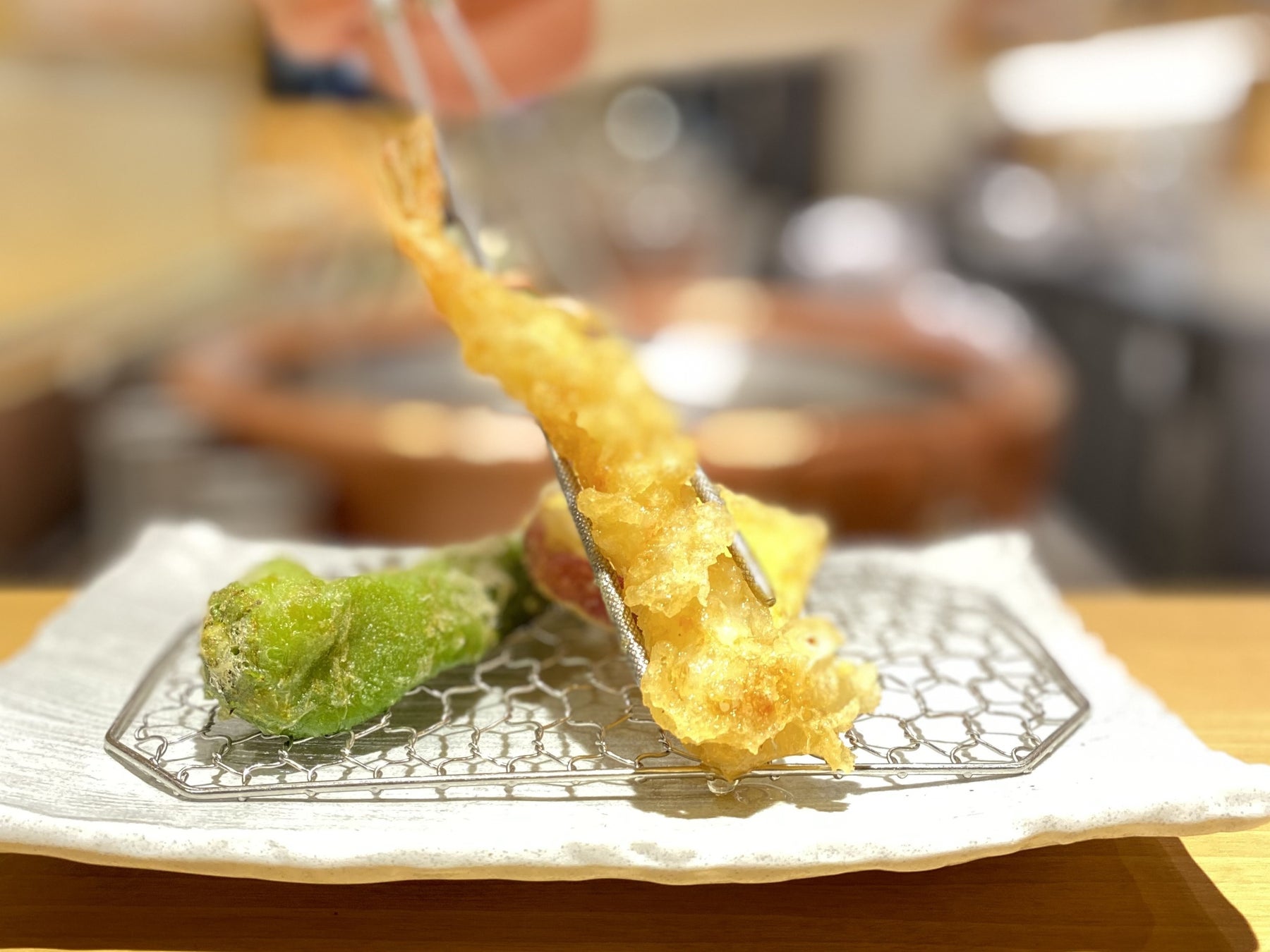 オリジナルブレンドの天粉を使い、白絞め油でカラッと揚げることで、食感と後味が軽やかなサクサクの衣に。衣の中で蒸しあげられることから“蒸し焼き料理”ともいわれる天ぷらですが、この蒸し上げる工程で食材の旨みをぎゅっと凝縮します。食材ごとに衣のまとわせ方や投入後の振り、揚げ時間にもこだわり、食材のおいしさを最大限引き出します。