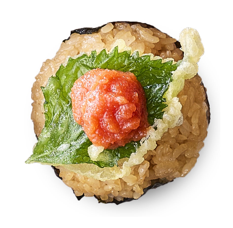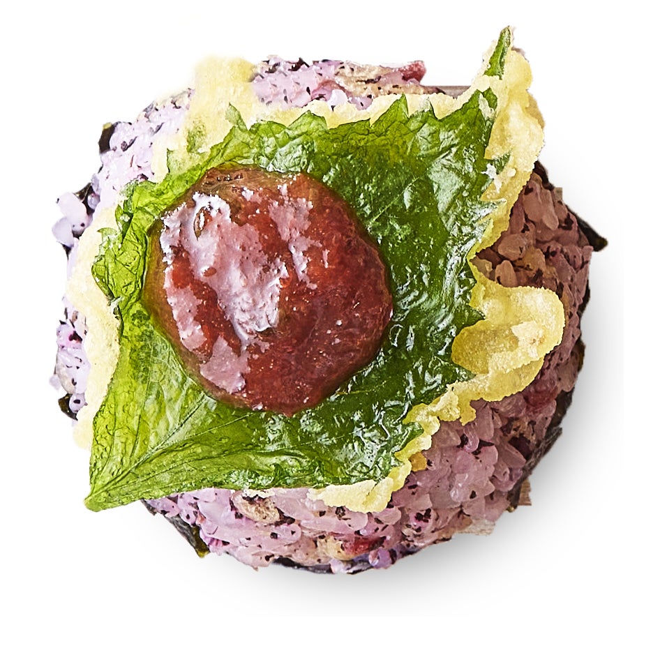 赤シソごはんにイカ天、そして大葉天と梅かつおが加わり、和の風味が広がるおむすびです。
