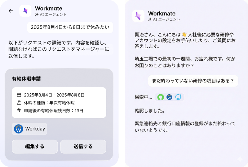 今回、日本語対応が完了した主なAI機能は次の2つです。1つは、従業員へ必要な情報を届ける 「AIポッドキャスト」。もう1つは、社内の業務窓口としてタスク完了まで支援する 「AIアシスタント」です。