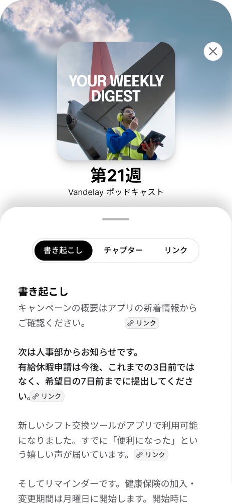 AIポッドキャストは、従業員一人ひとりに最適化された音声コンテンツをAIが自動生成し配信する機能です。