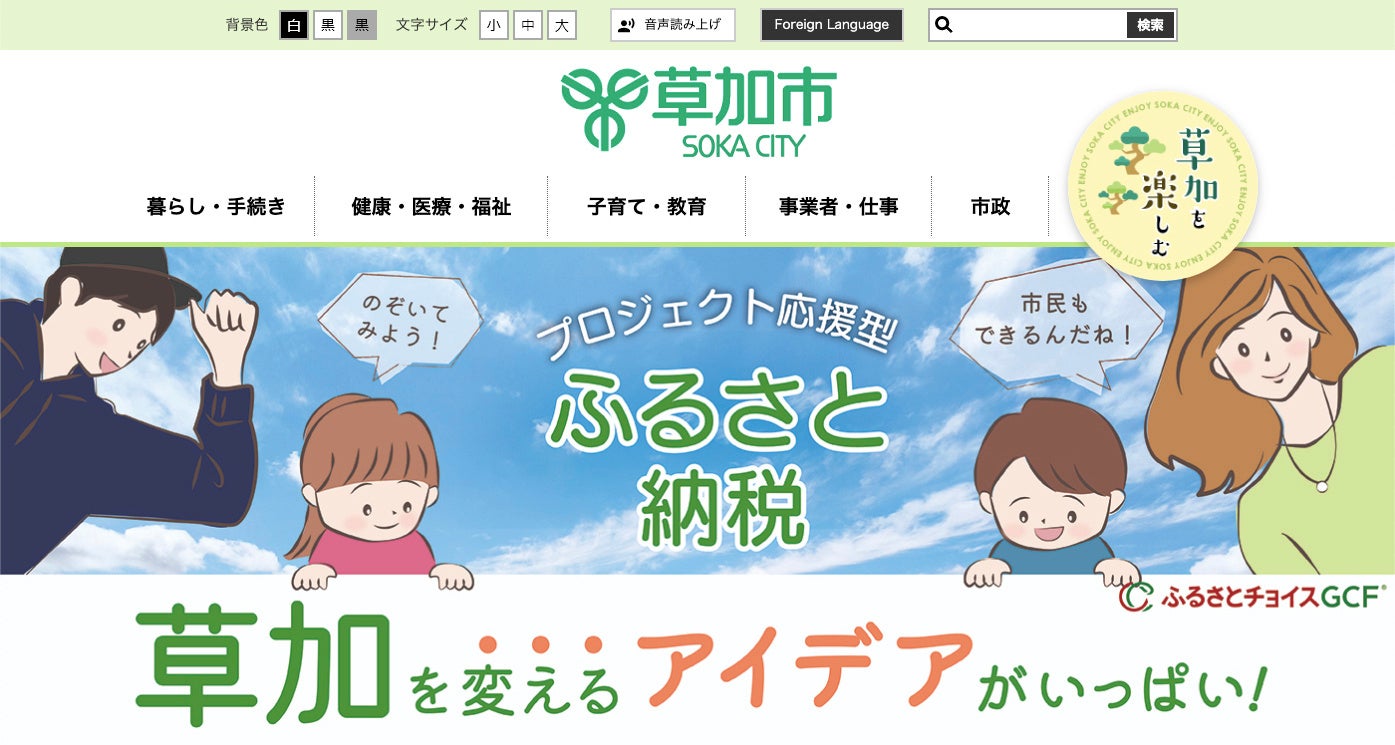 草加市では、GCF(ガバメントクラウドファンディング)へも積極的に取り組んでいます。地域と行政が一緒になって、まちづくりや地域課題の解決のために行動し、まちづくりにつながるプロジェクトを立ち上げ、共感の輪を広げています。