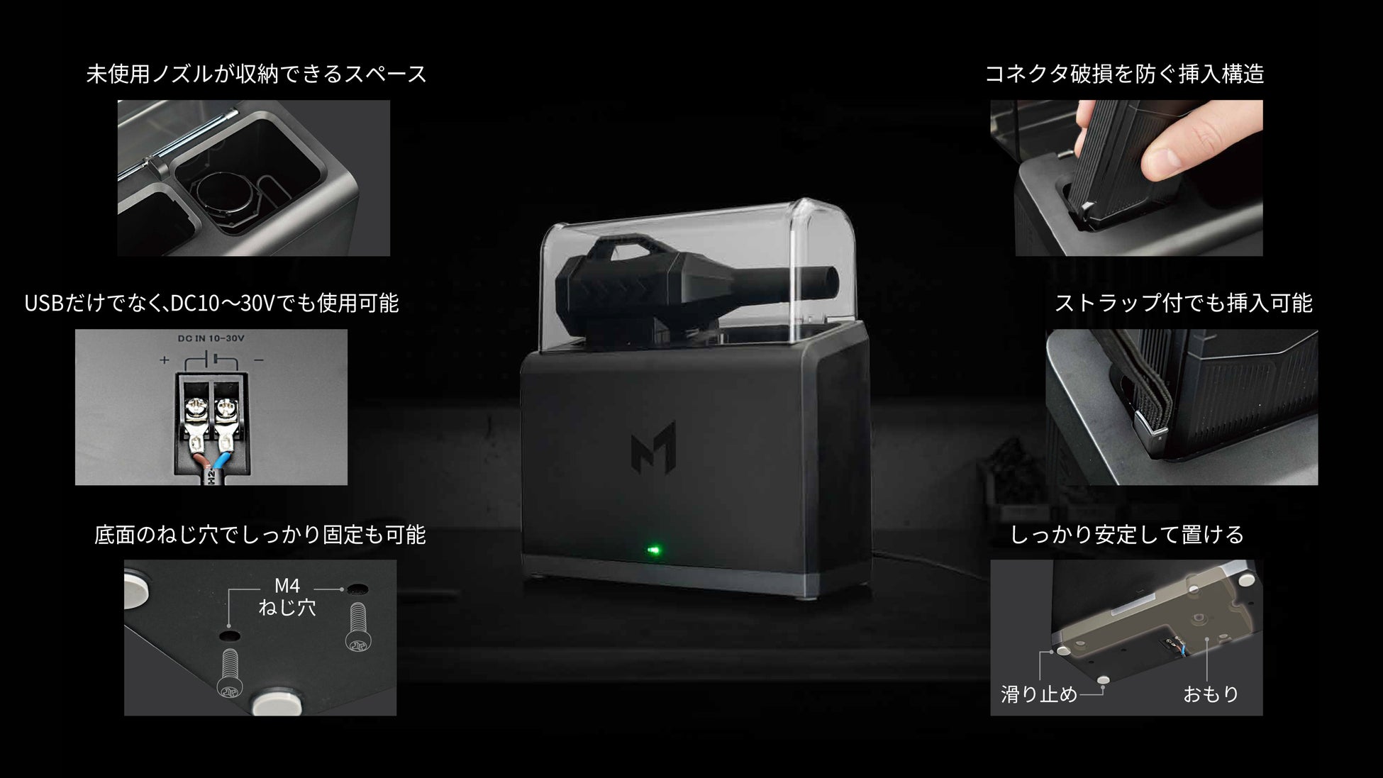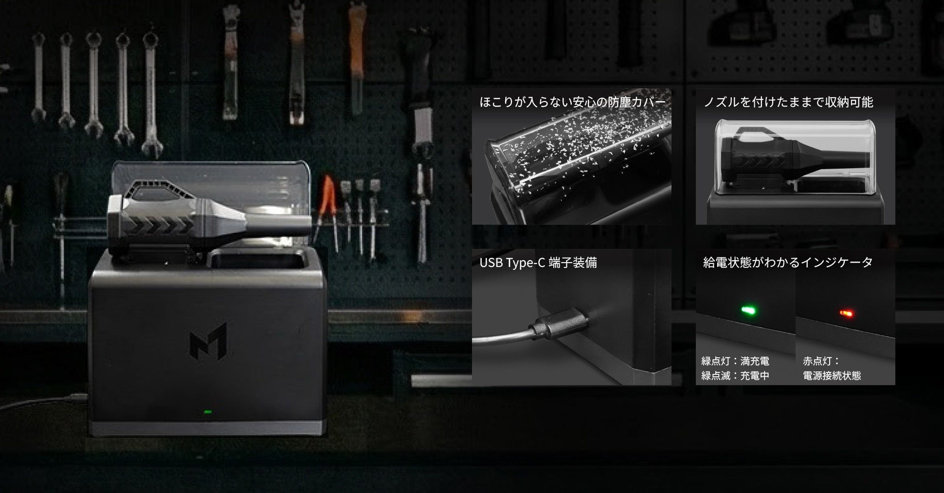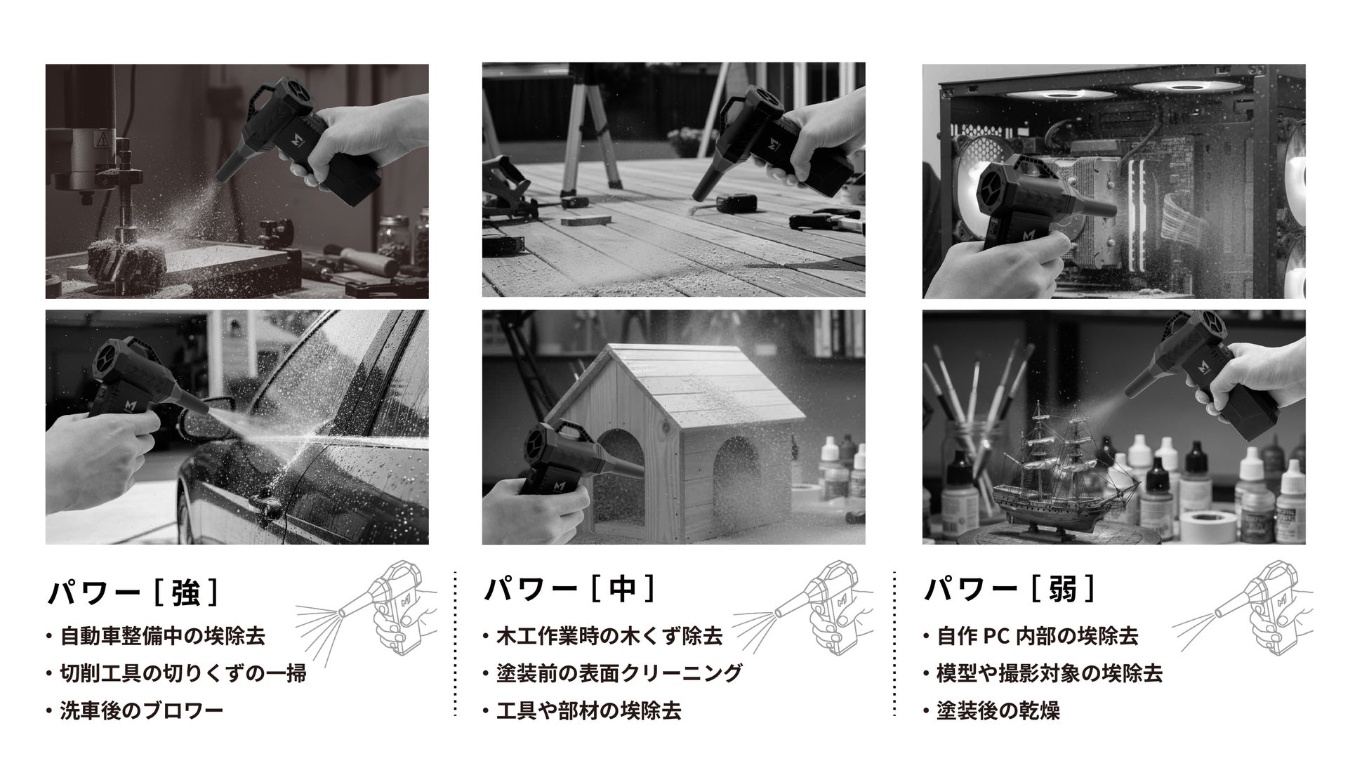 その高い風圧性能は、木工やDIYで出る粉塵の飛ばし作業、車まわりのメンテナンス、模型・機器類の細かなホコリ除去など、幅広いシーンで活躍します。強・中・弱の3段階パワー切替により、日常用途から専門的な作業まで、目的に応じて最適な風量を選択できます。さらに、専用の充電ステーションは“挿すだけ”で充電が完了する設計を採用。工具の保管場所と充電管理を一体化し、使いたいときにすぐ使える快適な運用性を実現しています。