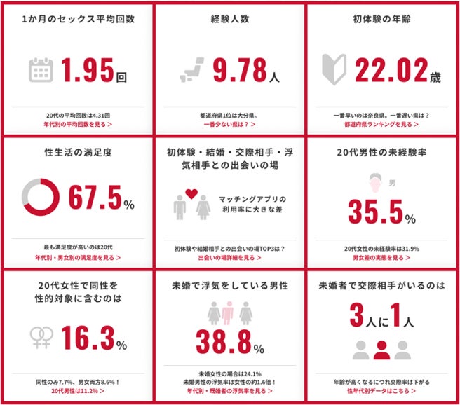 セックスの回数・経験人数・初体験、満足度や浮気など、性生活の実態を徹底調査! セックスレスに関する検証や都道府県別のランキングも発表!