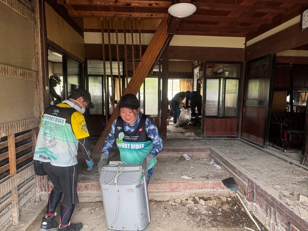 にっぽん応援ツーリングの参加ライダーが支援したのは、昨年9月の豪雨による土砂崩れで甚大な被害を受けた個人宅です。家屋の大きな傾きはなかったものの、1階部分が乾燥した泥で覆われ、家財道具の搬出が困難な状態でした。