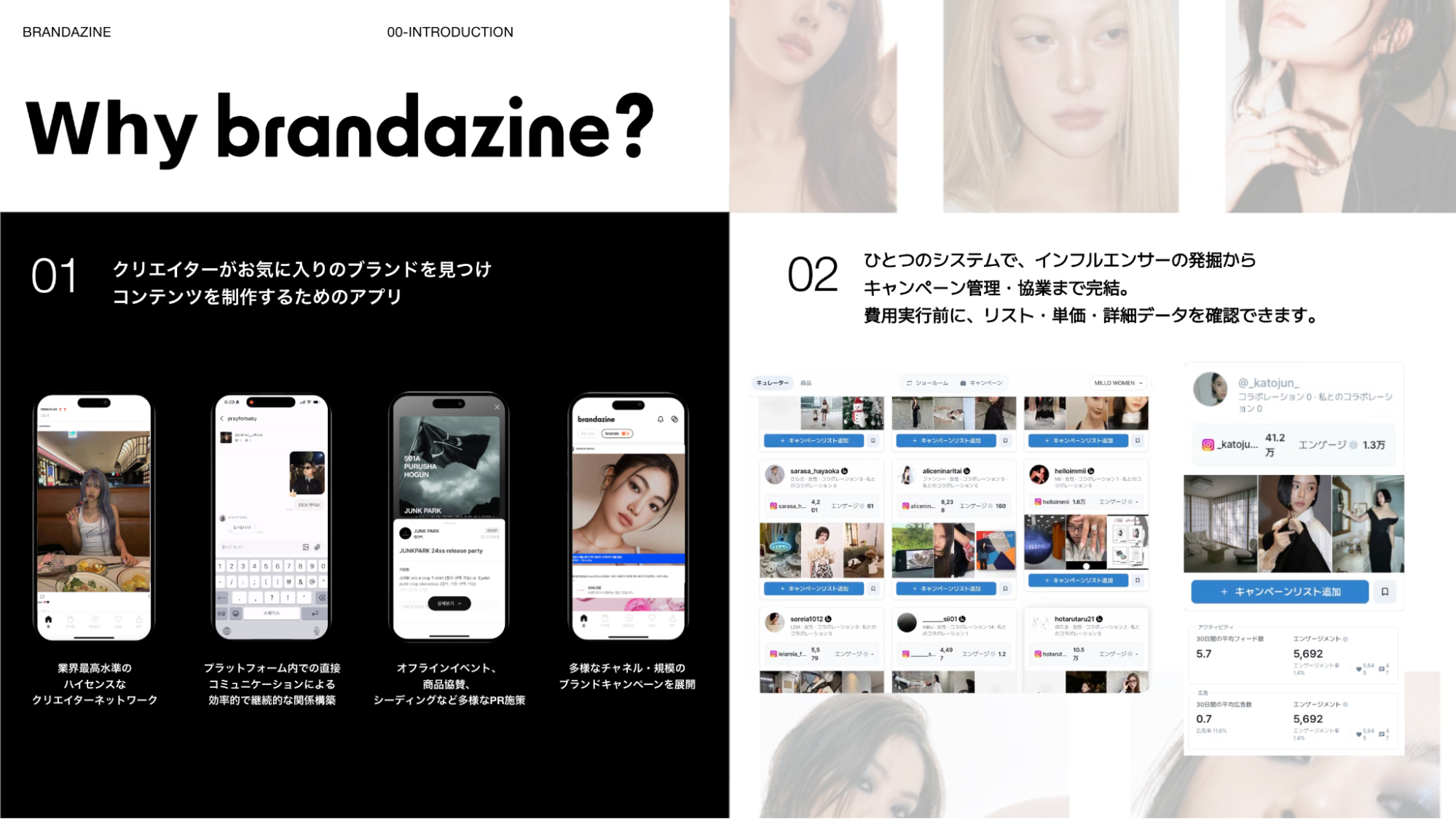 また、2025年4月に日本市場へ参入して以降、Brandazineは急速に事業を拡大しており、今年度末までに日本国内のクリエイターネットワークを約2,000名規模に成長させる見込みです。現在は日本の有力デザイナーズブランドとのパートナーシップ構築に注力し、下半期には日本のビューティーブランドやライフスタイルブランドとの協業に注力していく予定です。韓国で実証済みのプレイブックとデータドリブンの手法を活かし、計測可能かつブランドイメージに沿ったクリエイターキャンペーンを求める日本の有力ブランドにとって、信頼のおけるマーケティングパートナーとなることを目指します。