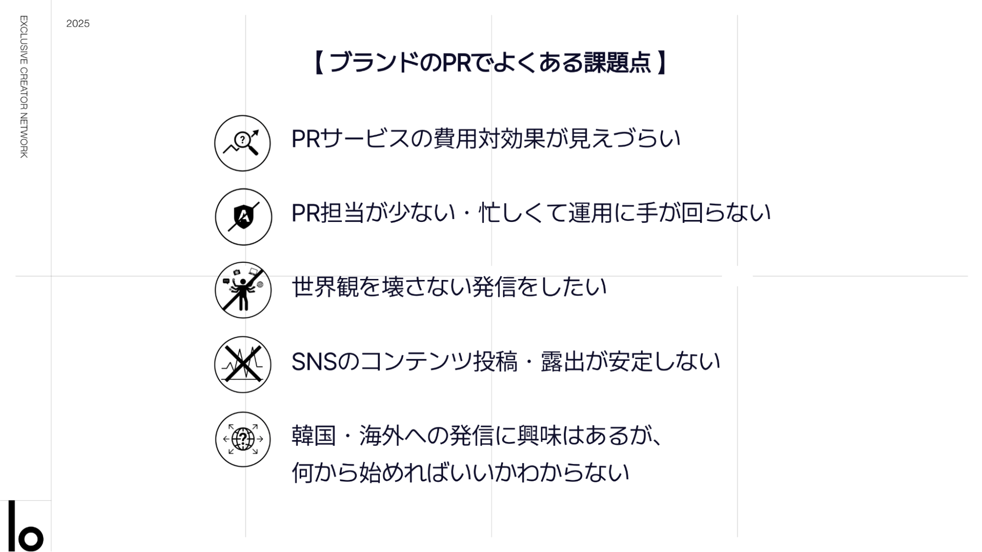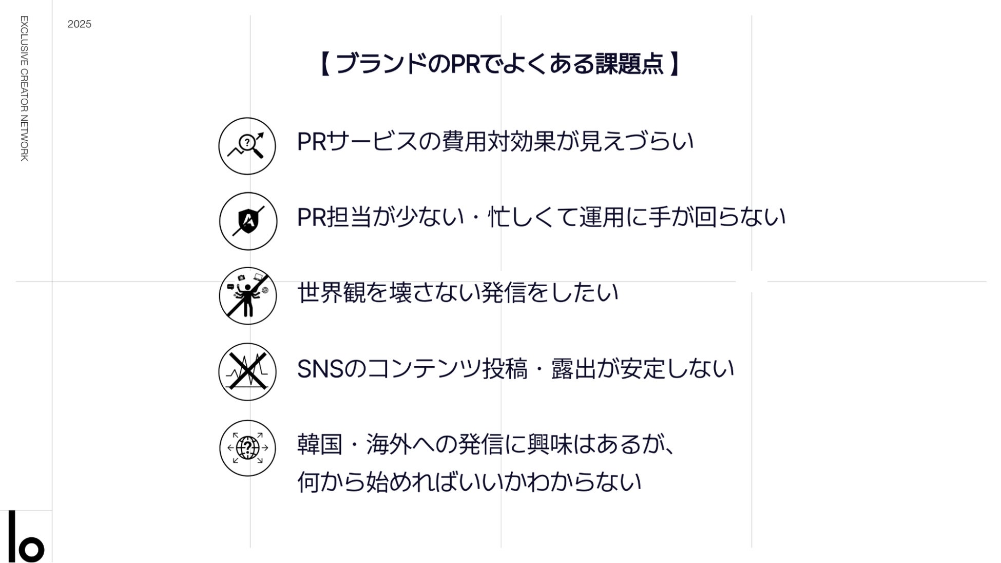 現在、約9,000名の契約クリエイターが登録しており、Converse、Wooyoungmi、Mulberry、Michael Kors、サザビーリーグ、Hince、アモーレパシフィック、MUSINSA、現代百貨店など、韓国内外の800以上の有力ブランドと協業しています。クリエイターコンテンツ制作のエンドツーエンドプロセス、ソーシャルメディアデータを統合したデータインフラ、そしてAI技術の活用により、透明性と戦略的整合性を伴って実行されるクリエイターマーケティングは、従来の運用型広告チャネルと比較して大幅にコスト効率が高く効果的であることを実証してきました。