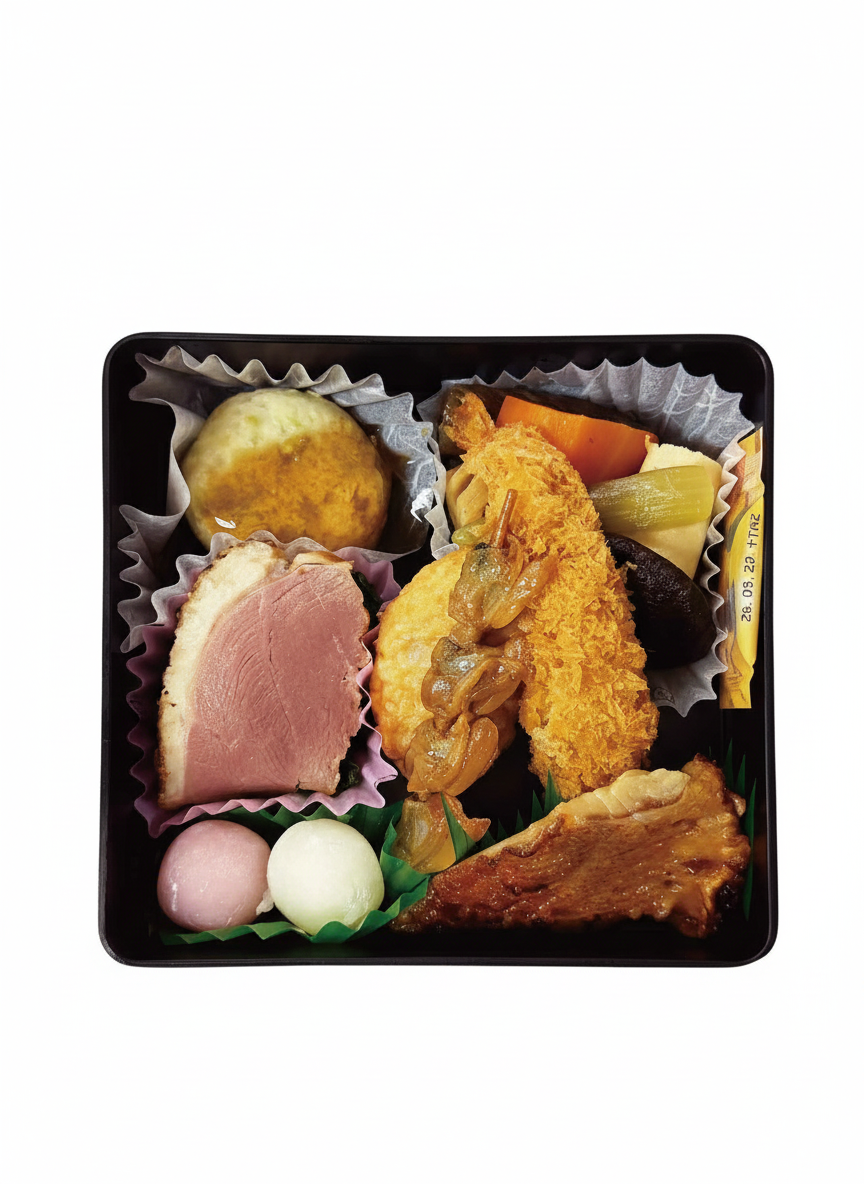 赤魚西京焼き / 軟骨入り鶏つくね / 海老フライ / 合鴨スライス / 菜の花漬け / アサリ串 / ふわふわ豆腐黒酢かけ / 煮物(椎茸、こんにゃく、フキ、人参、竹の子、高野豆腐) / 紅白饅頭