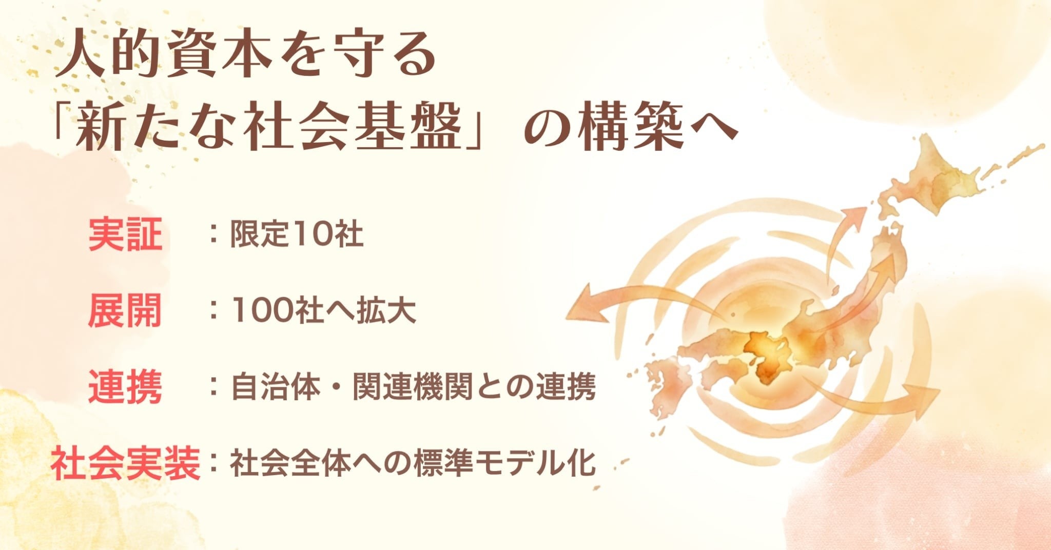 本プロジェクトを通じて実践事例を創出し、将来的には、本モデルを社会全体に展開可能な標準モデルとして整理します。また、自治体・関連機関との連携も視野に入れ、人的資本を守る社会基盤の構築を目指します。ケアを隠さなくてよい社会ではなく、ケアが職場の判断に反映される社会を実現します。