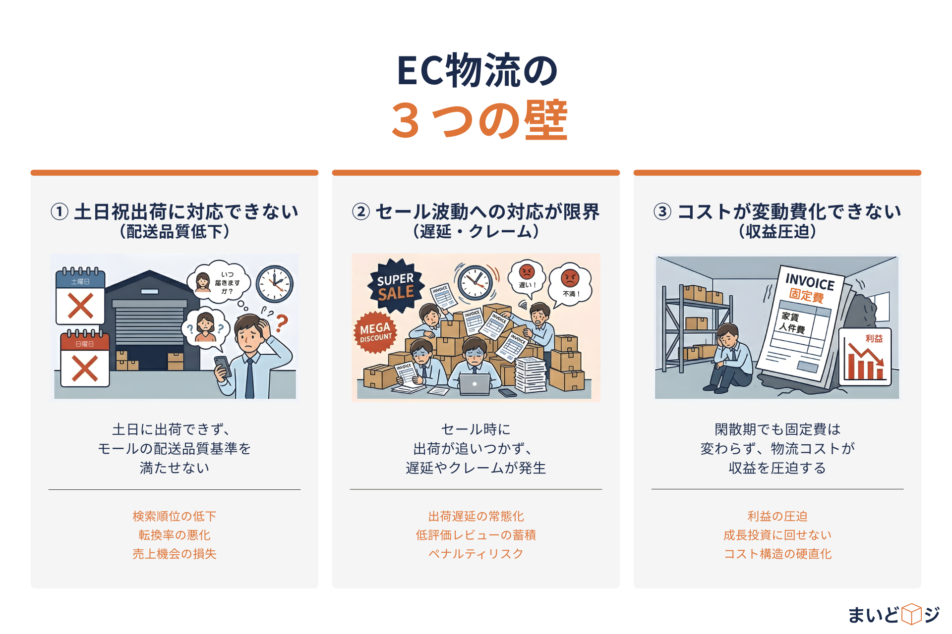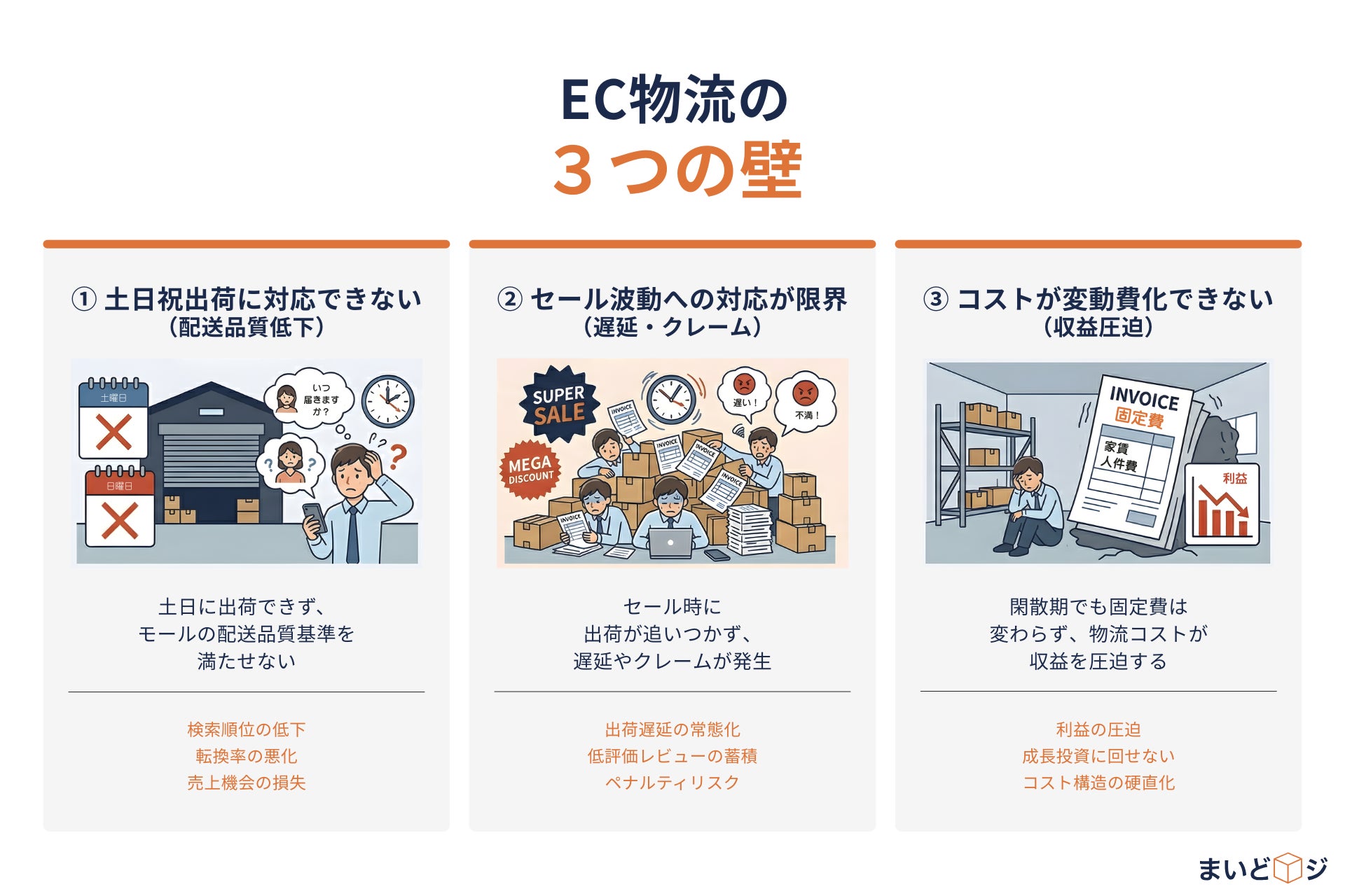 出荷が止まれば、売上が止まる。まいどロジは、FBAを含む数十万件規模の出荷実績で培った現場力を背景に、この3つの壁を初期費用・月額固定費ゼロの完全従量制で取り除きます。