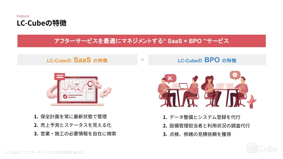 また、「保全営業に人手を割けない」という企業向けには、専用システムとBPO(業務代行)を組み合わせた「LC-Cube BPaaS」も用意しており、業界特化の営業知見を活かし、既設顧客へのアプローチから見積依頼の獲得まで包括的にサポート可能です。