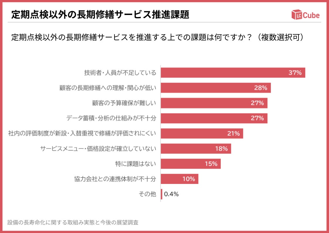 本調査では、長期修繕マネジメントの推進において「技術者・人員の不足」や「顧客の理解・関心の低さ」が主要な障壁として浮かび上がりました。
