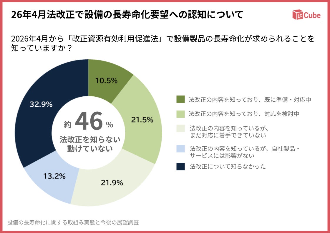 加えて、2026年4月施行の改正資源有効利用促進法について「知らなかった」が32.9%、「知っているが未着手」が21.9%と、対応に動けていない企業が全体の半数を超えており、業界全体での取り組み加速が急務となっています。