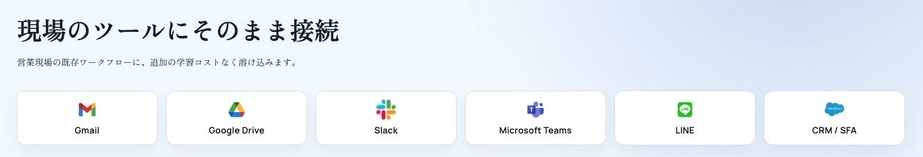 Gmail、Google Drive、Slack、Microsoft Teams、LINE、CRM/SFAなど、営業現場で使用されている既存ツールにそのまま接続可能です。